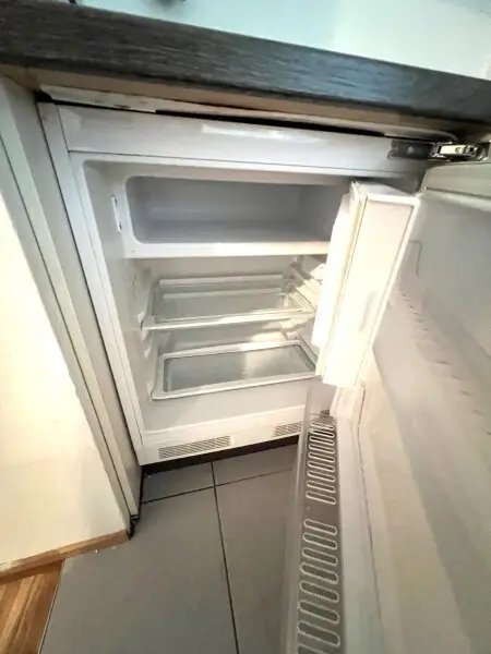Die Küche ist mit einem kleinen Kühlschrank, Herd mit Backofen und Spüle, sowie Unter- und Oberkasten eingerichtet.