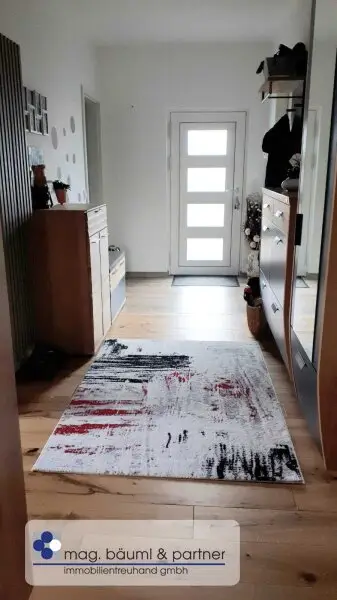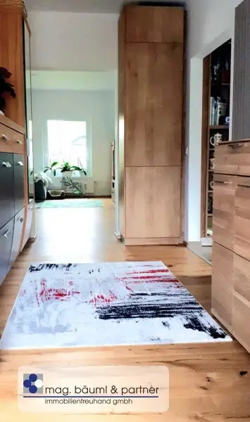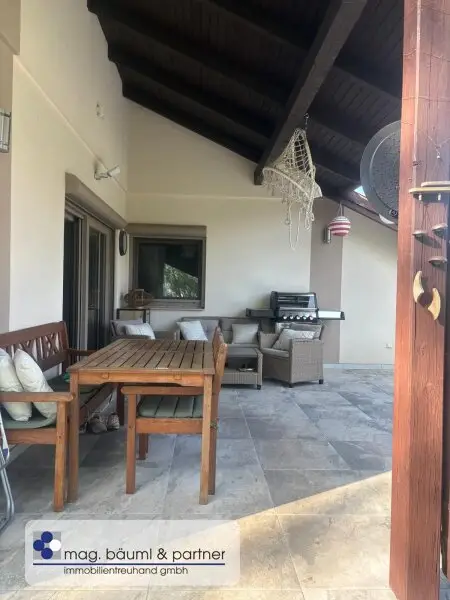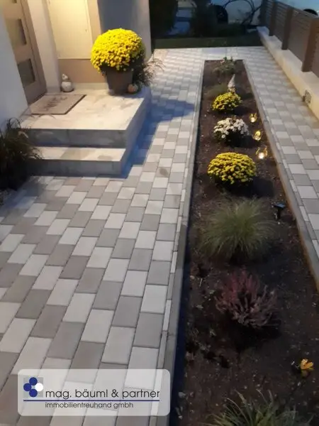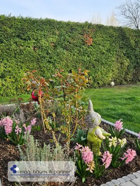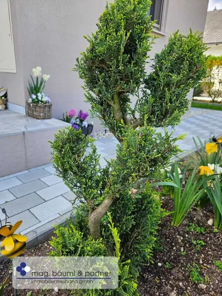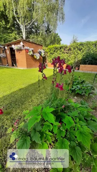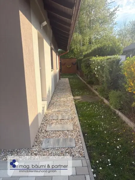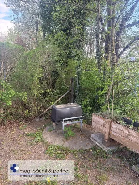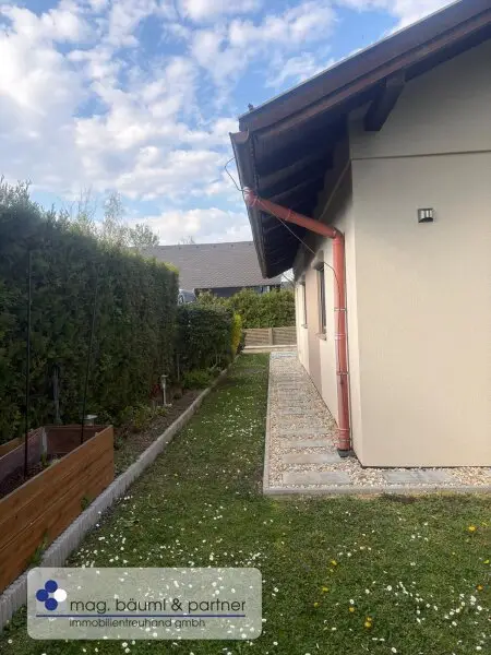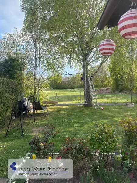 Durch einen Vorgarten mit neuem Zaun kommt man bequem zur Eingangstüre des Bungalows. Vom Vorzimmer aus sind alle Räume zentral erreichbar. Die Schlafräume sind nordseitig angelegt und kühl, zentral zu begehen und das Wohnzimmer ist mit Ausgang auf die Terrasse, die südseitig und überdacht ist - so ist es von Anfang des Sommers bis spät in den Herbst ein erweitertes Wohnzimmer und jetzt durch die Neugestaltung ist es eine ideale Sommerküche Der Blick in den gepflegten Garten mit Altbaumbestand und einem geschlagenen Brunnen der mit einer elektrischen Pumpe den Garten bewässert- ist bequem und kostengünstig.
