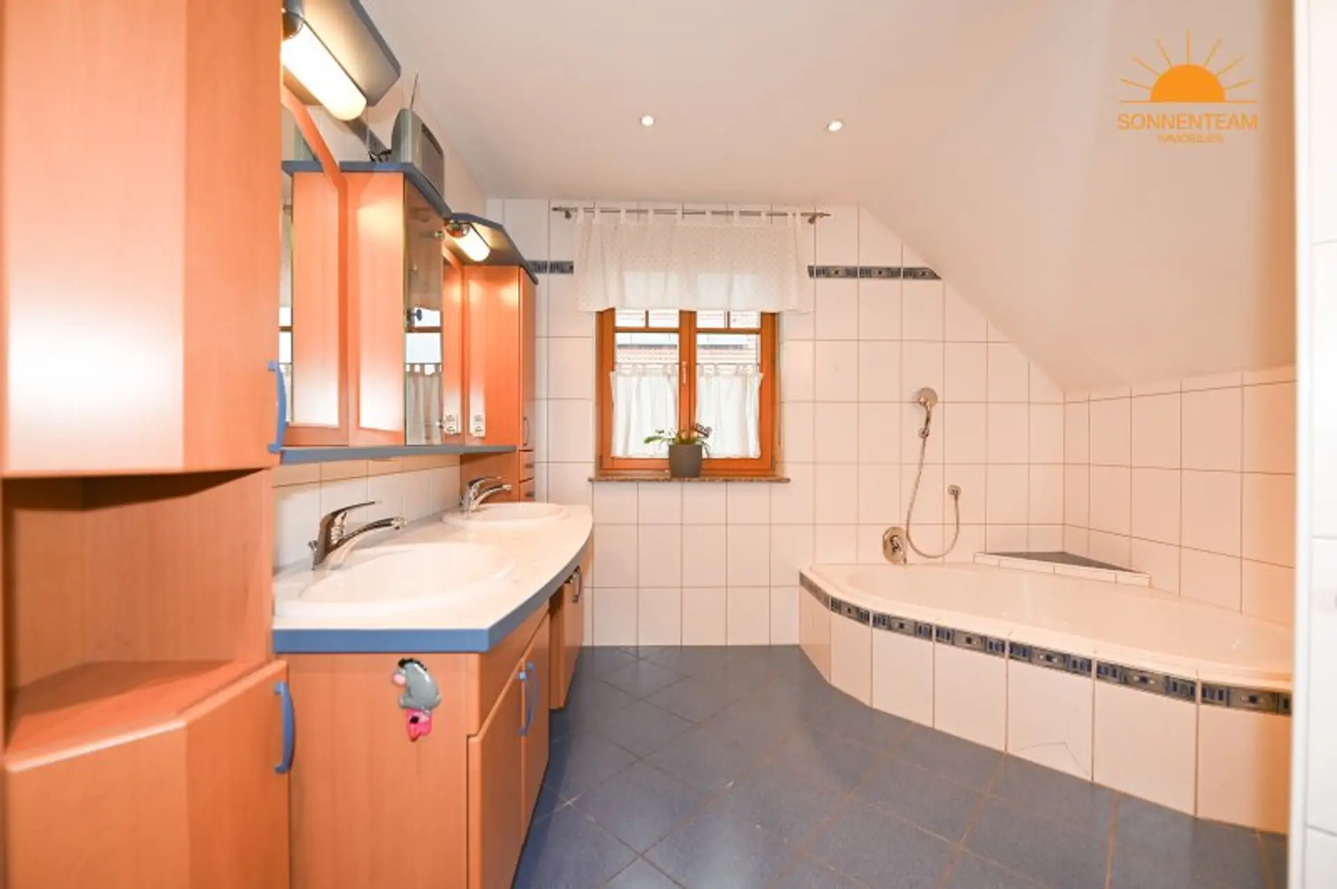 Modern ausgestattetes Badezimmer mit Badewanne und WC