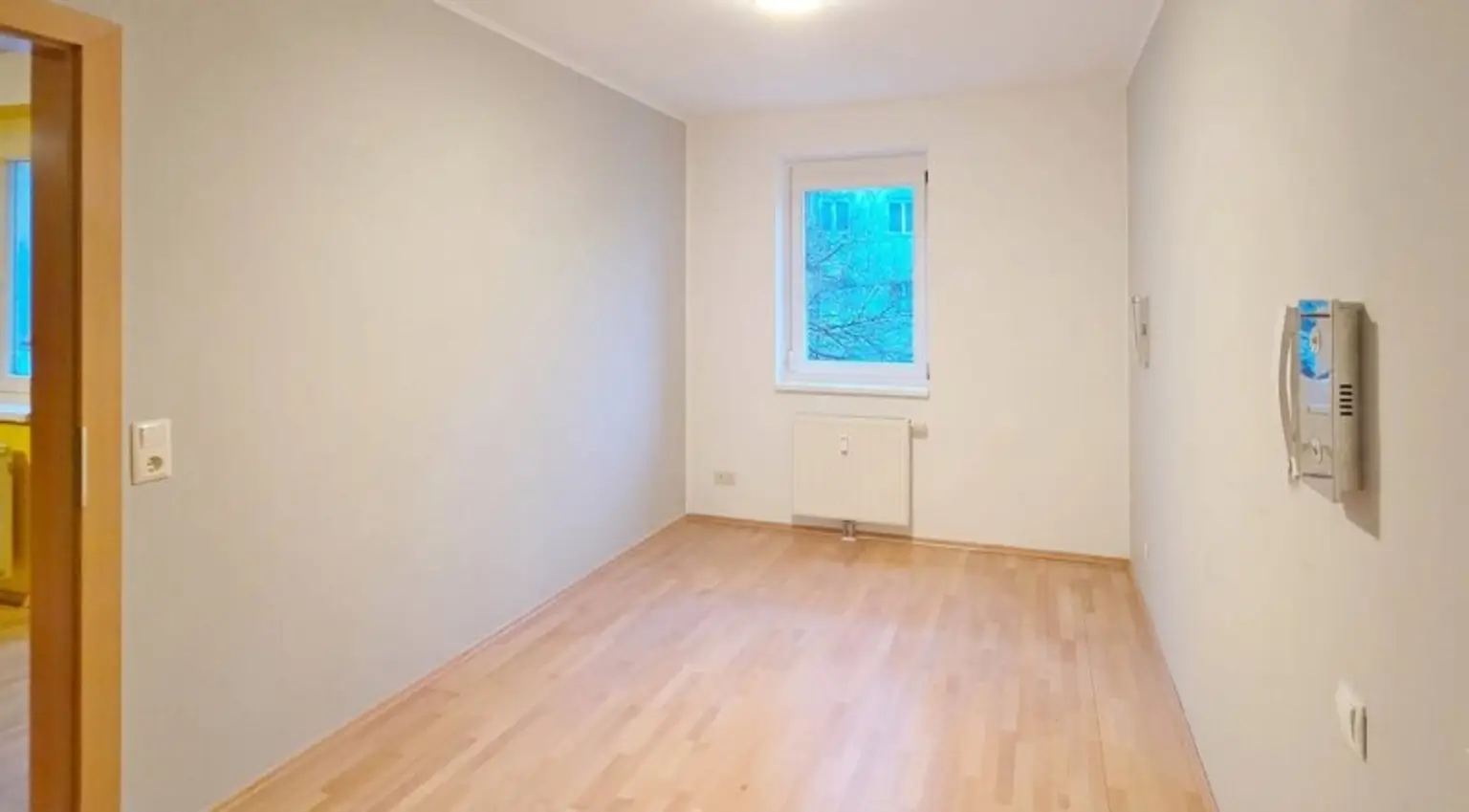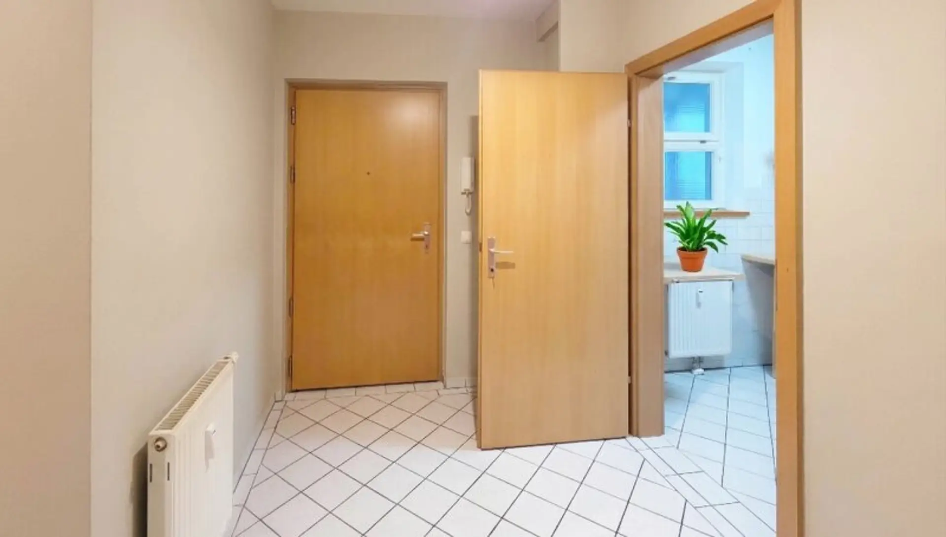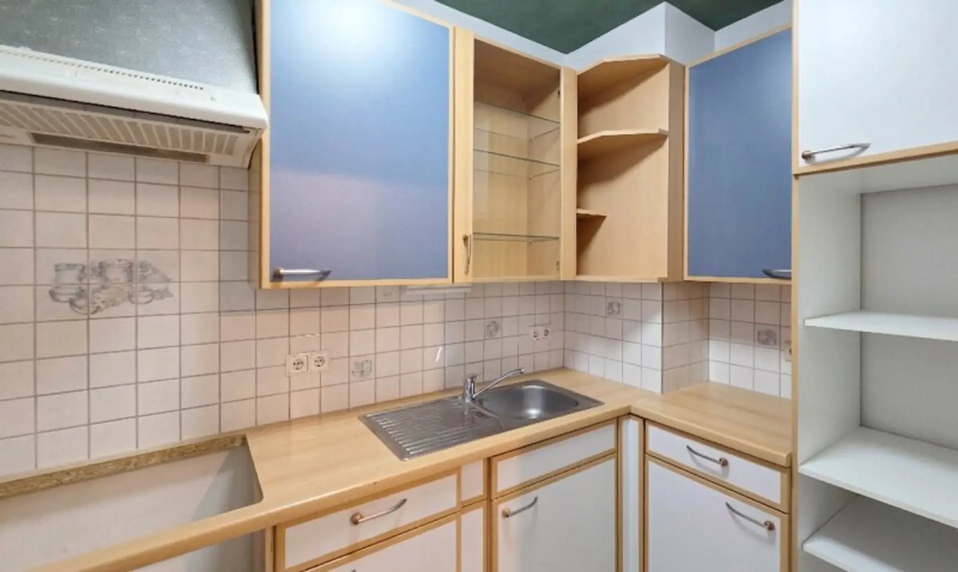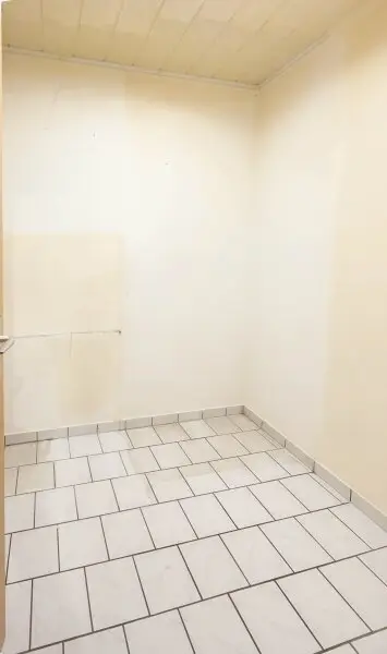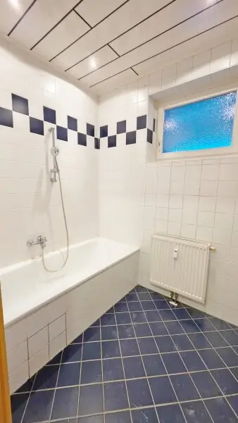 Hier in diese 2 Zimmer- Wohnung, können Sie sofort einziehen, eine neue Farbe hat sie bereits. Das Badezimmer wurde belassen – eines mit weißen und einigen dunkelblau Fliesen kombiniert und es hat eine Badewanne. Eine Besonderheit, Sie haben hier Deckenlautsprecher.