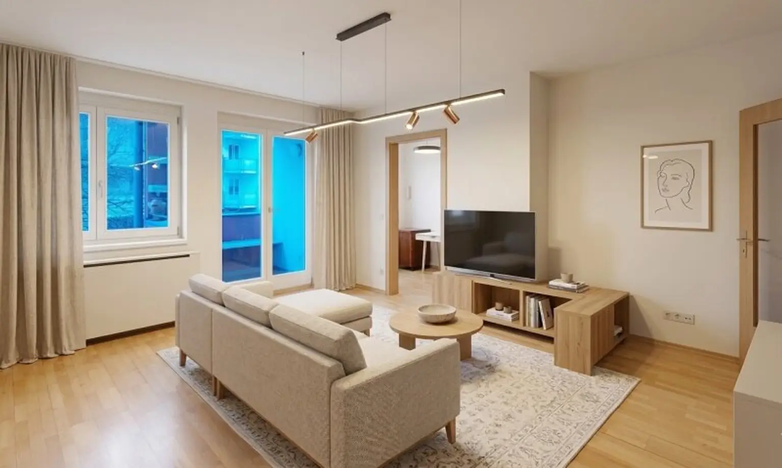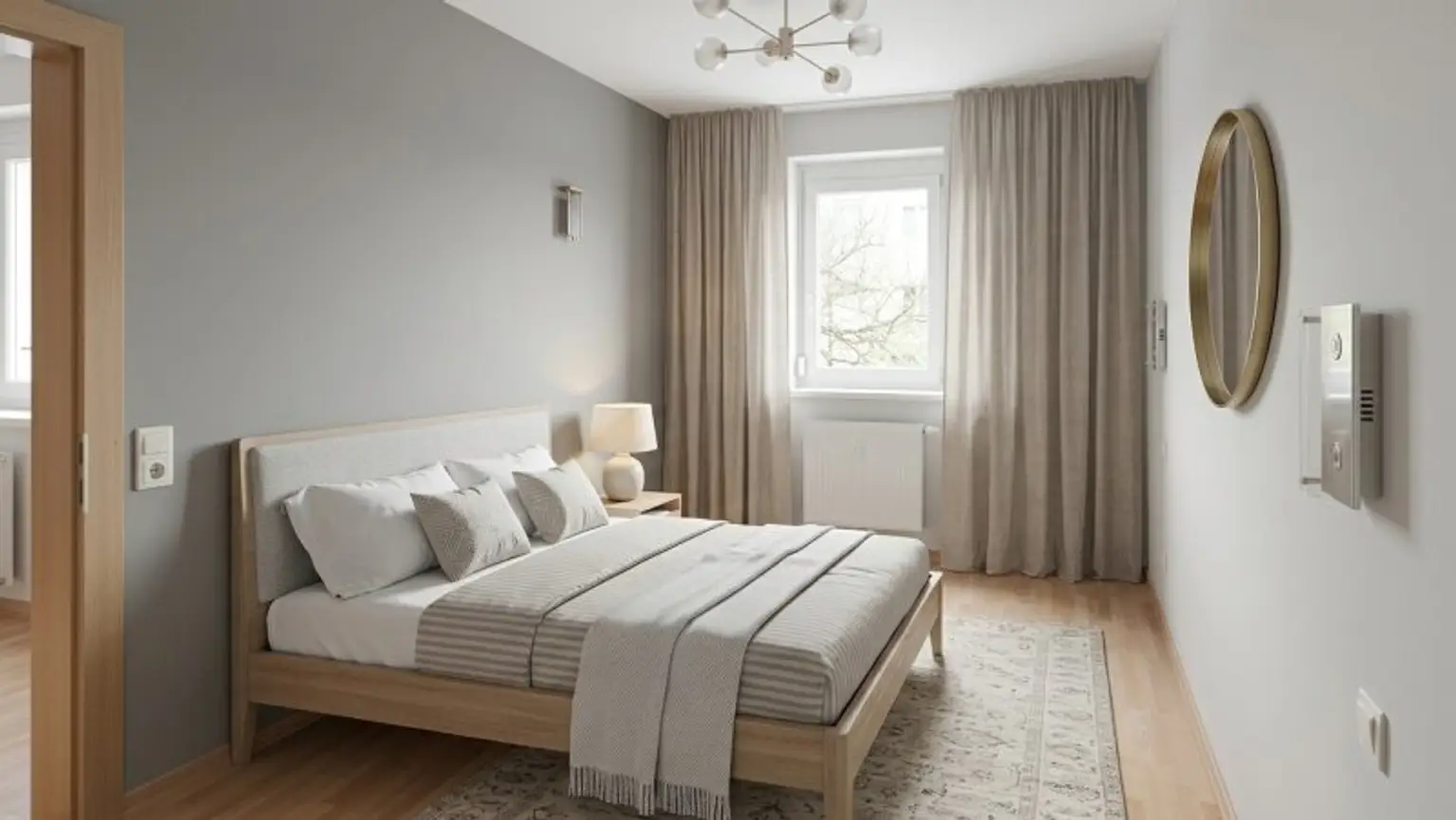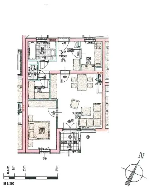 Die Wohnung beginnt mit einem weitläufigen Raum. Die Zimmer sind zentral begehbar und rahmen diesen Vorraum ein. Das Schlafzimmer ist bewusst abgelegen geplant. Die Räume sind nach Süden und Norden ausgerichtet, das den ganzen Tag über, in die „Lebensräume“ ein gleichmäßiges natürliches Licht hereinlässt.