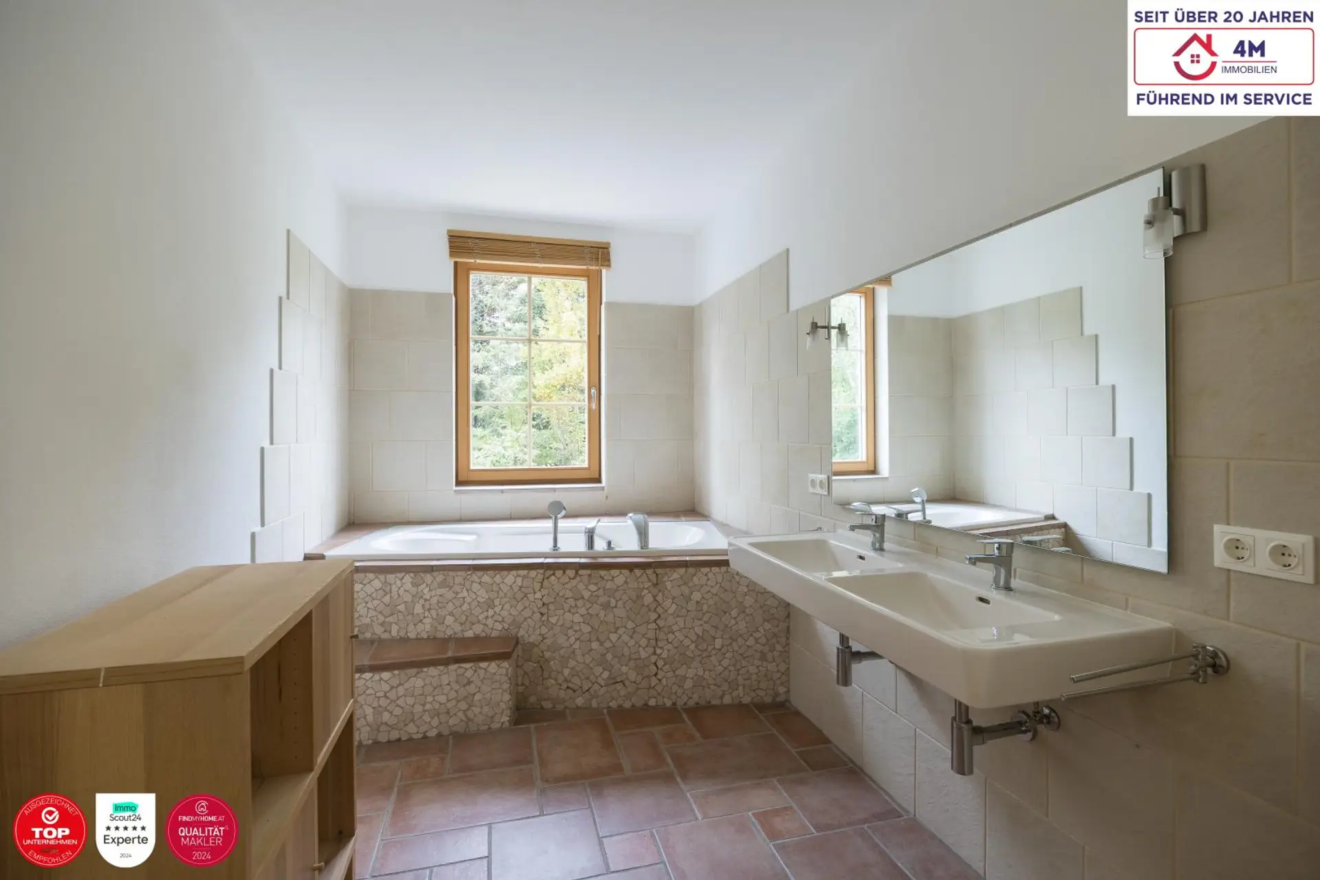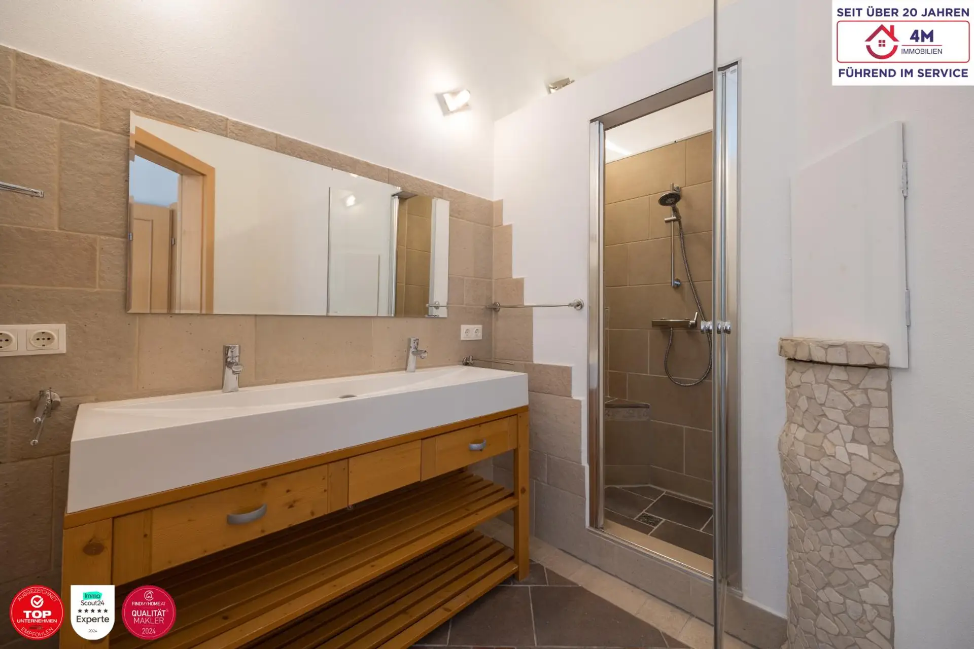 Die Bäder sind in sanften, natürlichen Tönen gehalten Sand, Taupe, Elfenbein. Feine Fliesen, edle Armaturen, großzügige Spiegelflächen und viel Licht schaffen eine Atmosphäre, die an ein Boutique-Hotel erinnert. Das große Familienbad im Obergeschoss mit Wanne und Doppelwaschtisch vermittelt Weite und Ruhe; das zweite Bad im Dachgeschoss mit bodengleicher Dusche wirkt modern, klar und elegant.