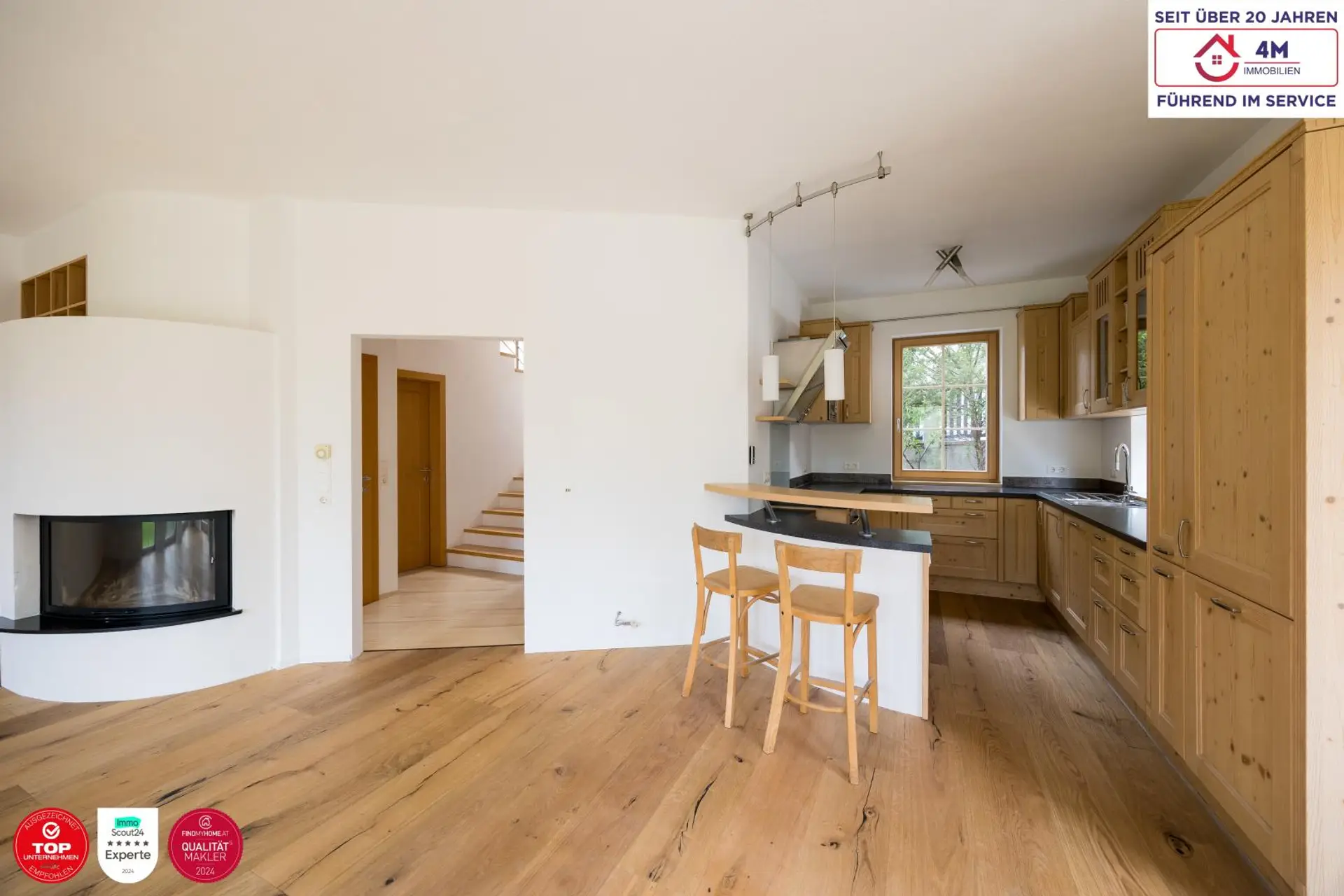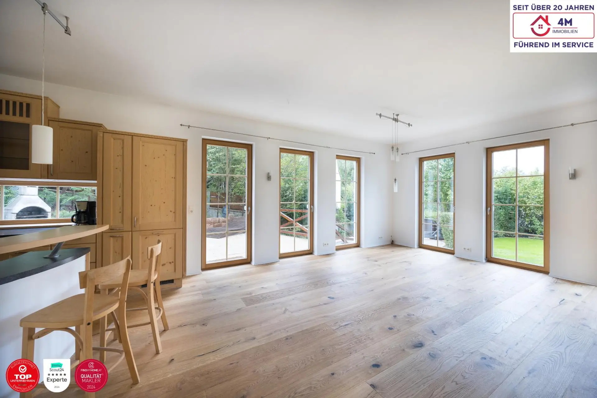 Schon beim Eintreten öffnet sich der großzügige Wohnbereich mit seinen bodentiefen, dreifach verglasten Fenstern, die das Tageslicht hereinfluten lassen und den Blick in den Garten freigeben. Der Kamin mit seiner hellgrauen Natursteinverkleidung bildet den ruhigen Mittelpunkt er spendet Wärme, Atmosphäre und einen Hauch zeitloser Behaglichkeit. Der neu verlegte Parkettboden schimmert in einem warmen Honigton und bringt eine angenehme Ruhe in die klaren Linien des Raumes.