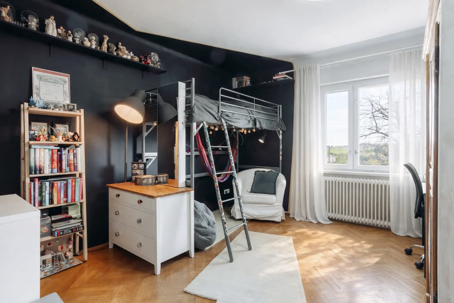 Im Obergeschoss befinden sich ein lichtdurchflutetes Schlafzimmer mit begehbarem Schrankraum, zwei Kinderzimmer, ein Badezimmer mit Badewanne und WC sowie ein überdachter Balkon mit schönem Blick ins Grüne.
