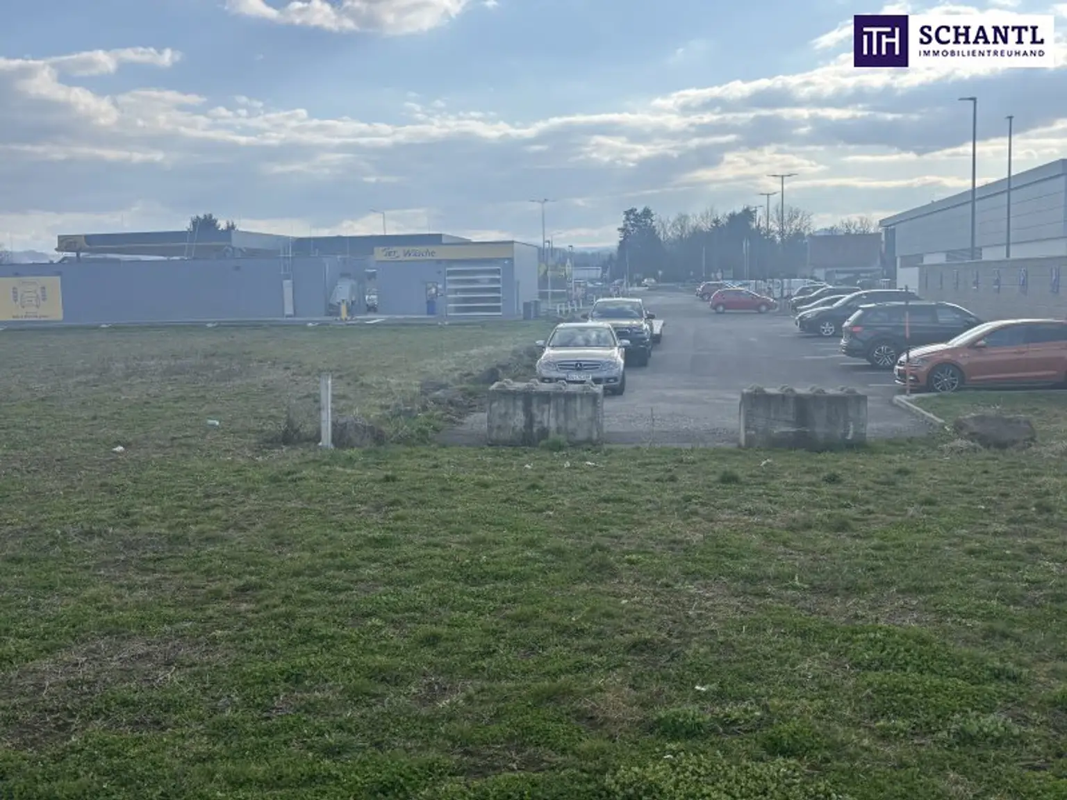 sich zwischen Lebensmittelmarkt und Tankstelle. Die Zufahrt direkt vom