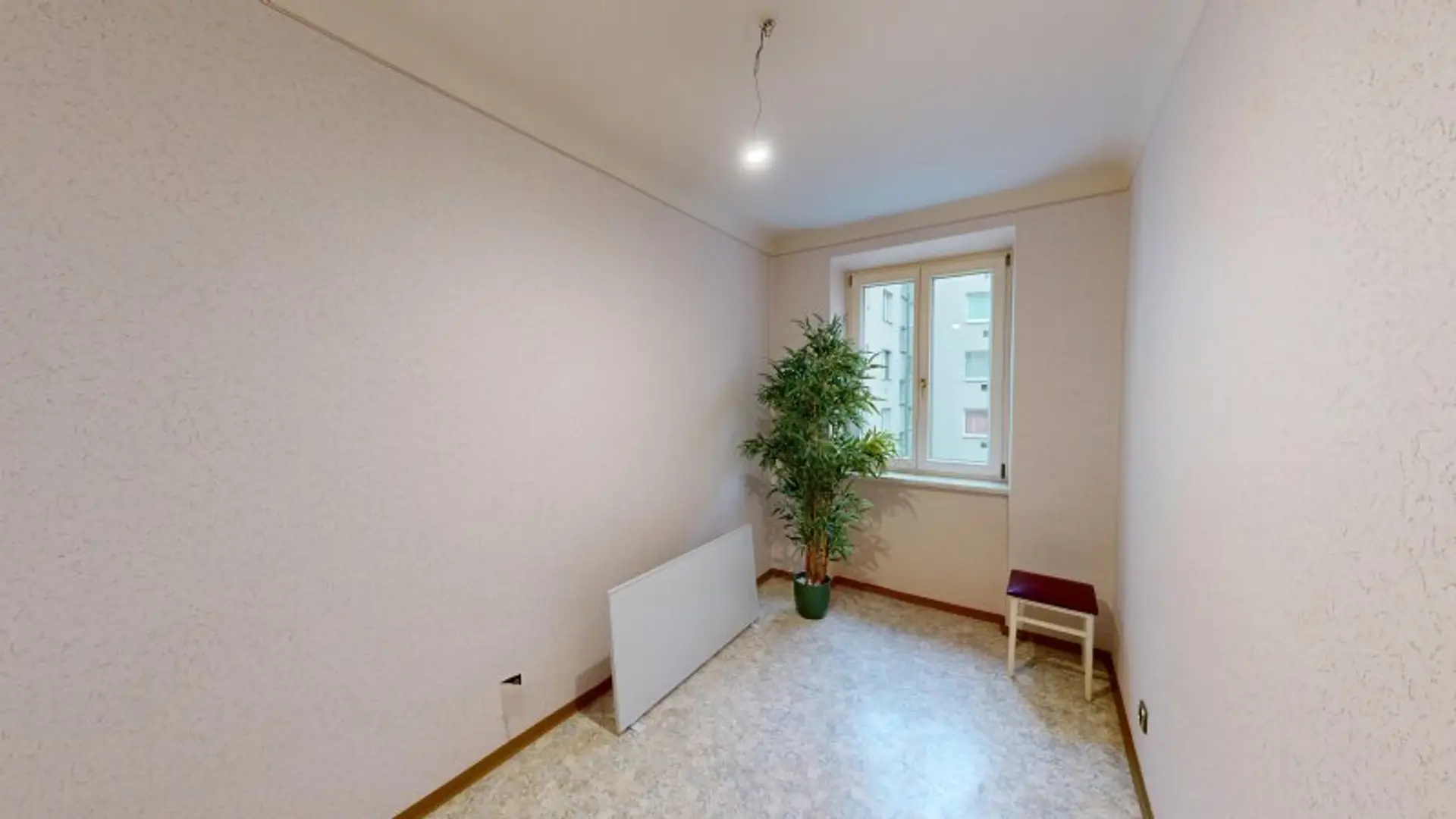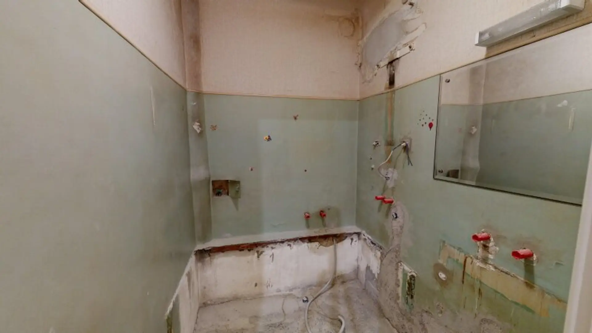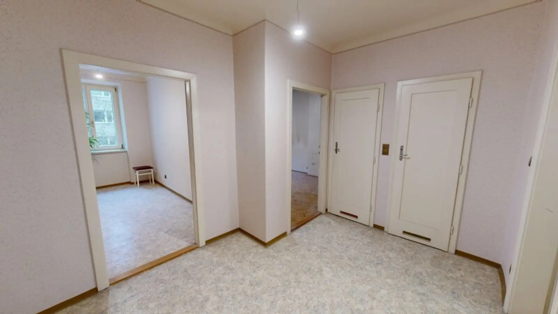 Die Wohnung verfügt über zwei separate Eingänge, insgesamt fünf Zimmer, eine Küche, zwei Bäder sowie zwei WCs. Ein Zimmer war ursprünglich als Küche vorgesehen und verfügt noch über verdeckte Küchenanschlüsse, was zusätzliche Flexibilität in der Grundrissgestaltung ermöglicht. Ein Badezimmer befindet sich in gutem Zustand, das zweite ist sanierungsbedürftig und bietet Raum für individuelle Anpassungen. Ergänzt wird das Raumangebot durch zwei Kellerabteile.