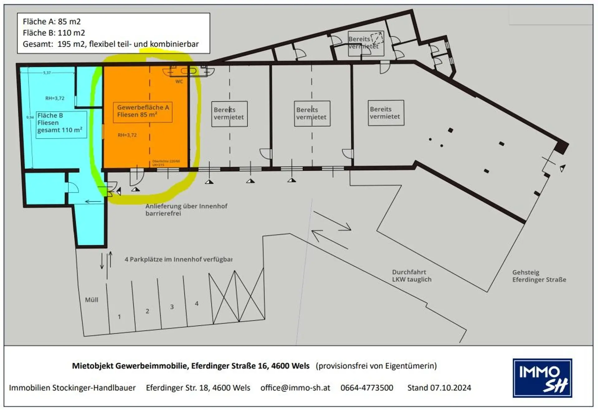 Lage: Direkt am Kreisverkehr Karl-Görlich-Platz, Eferdinger Straße 16, im Erdgeschoß, Zufahrt in den Innenhof mit LKW möglich, barrierefrei zur Gewerbe- bzw. Lagerfläche