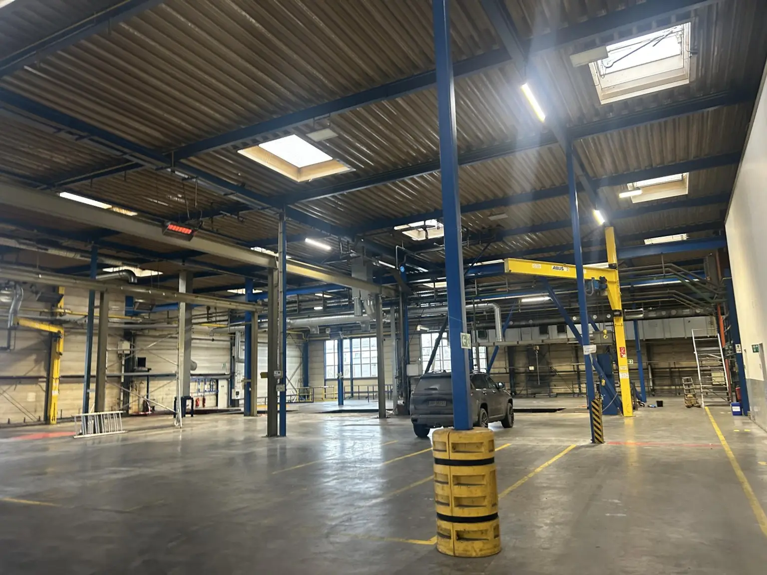 Die beheizte Halle verfügt über eine Hallenhöhe von 7,92 m, sechs Kräne (500 kg bis 5 t), zwei Rolltore (B 2,35m x H 3m und B 3,90m x H 3,10m), ein Flugdach (Länge: 18m; Breite: 8,50m; Höhe: 4,90m) sowie moderne technische Ausstattung wie Rauch- & Wärmeabzug, Alarm- und Lüftungsanlage. Die Bürobereiche sind klimatisiert. Ein erneuerter Brunnen sowie zwei zum Grundstück gehörende Trafos (gesamt 2.500 KVA) sichern eine leistungsstarke Infrastruktur.