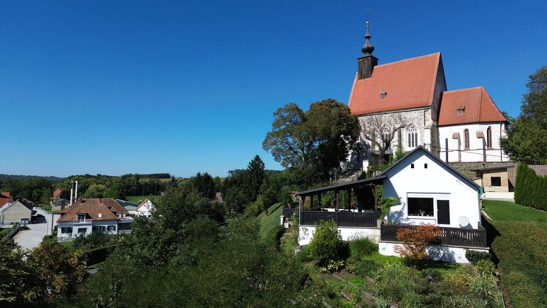 Direkt neben der Kirche gelegen, genießen Sie von der Terrasse einen traumhaften Panoramablick über Hannersdorf.