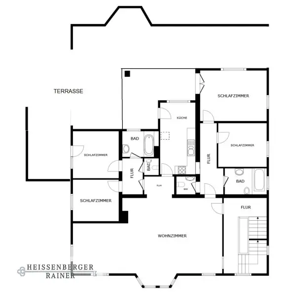 * weiterer Schlafbereich, begehbar vom Wohnbereich, mit zwei weiteren Schlafzimmern, Zugang zur Terrasse, Badezimmer und separater Toilette