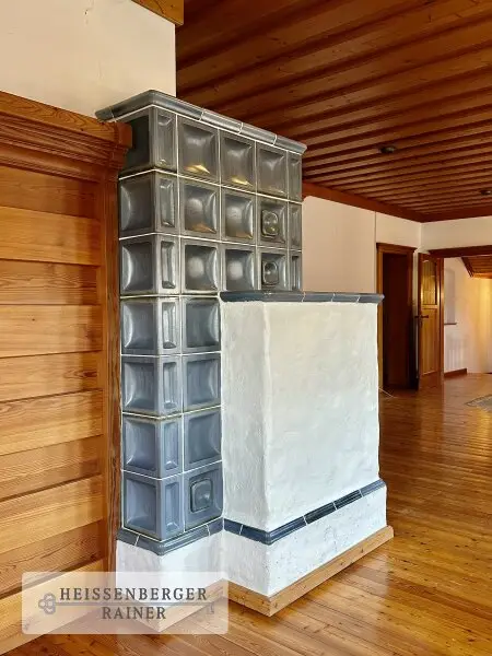 * großer Kachelofen, zentral positioniert im Wohnbereich