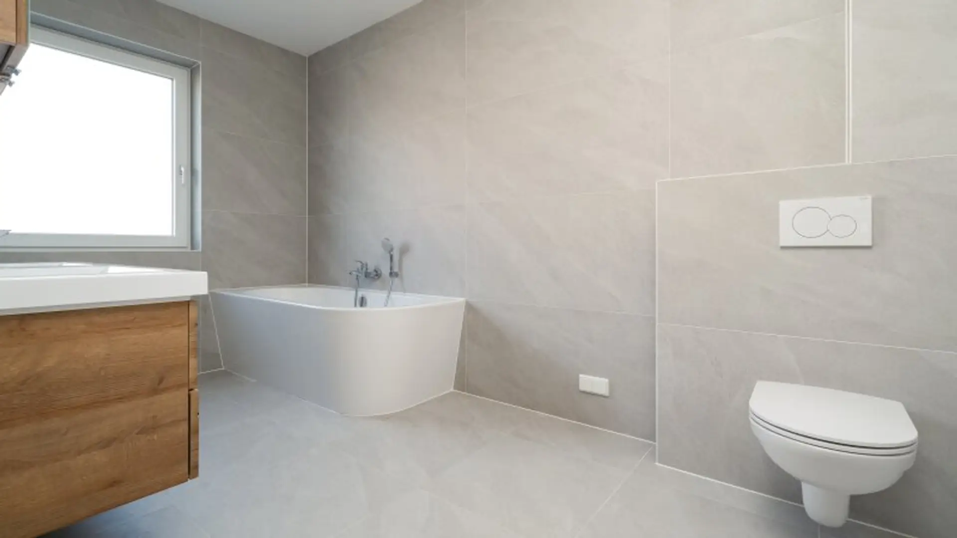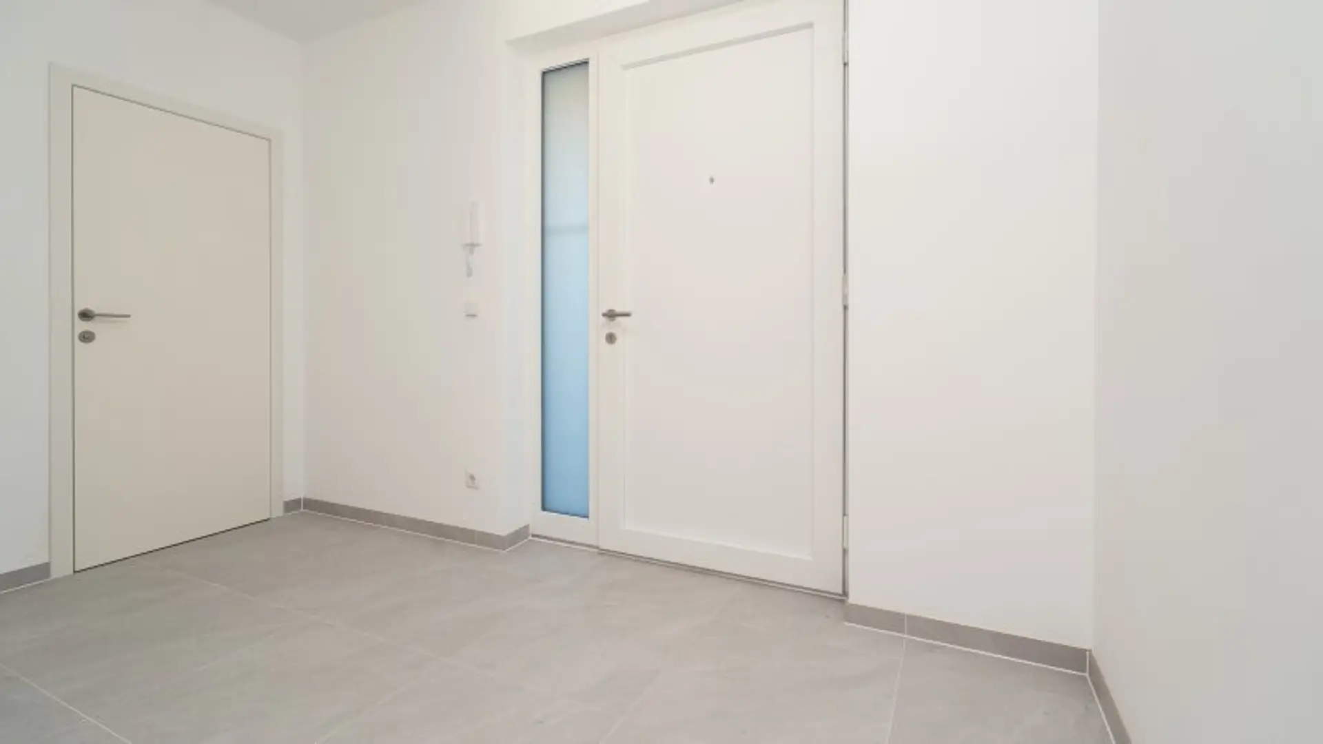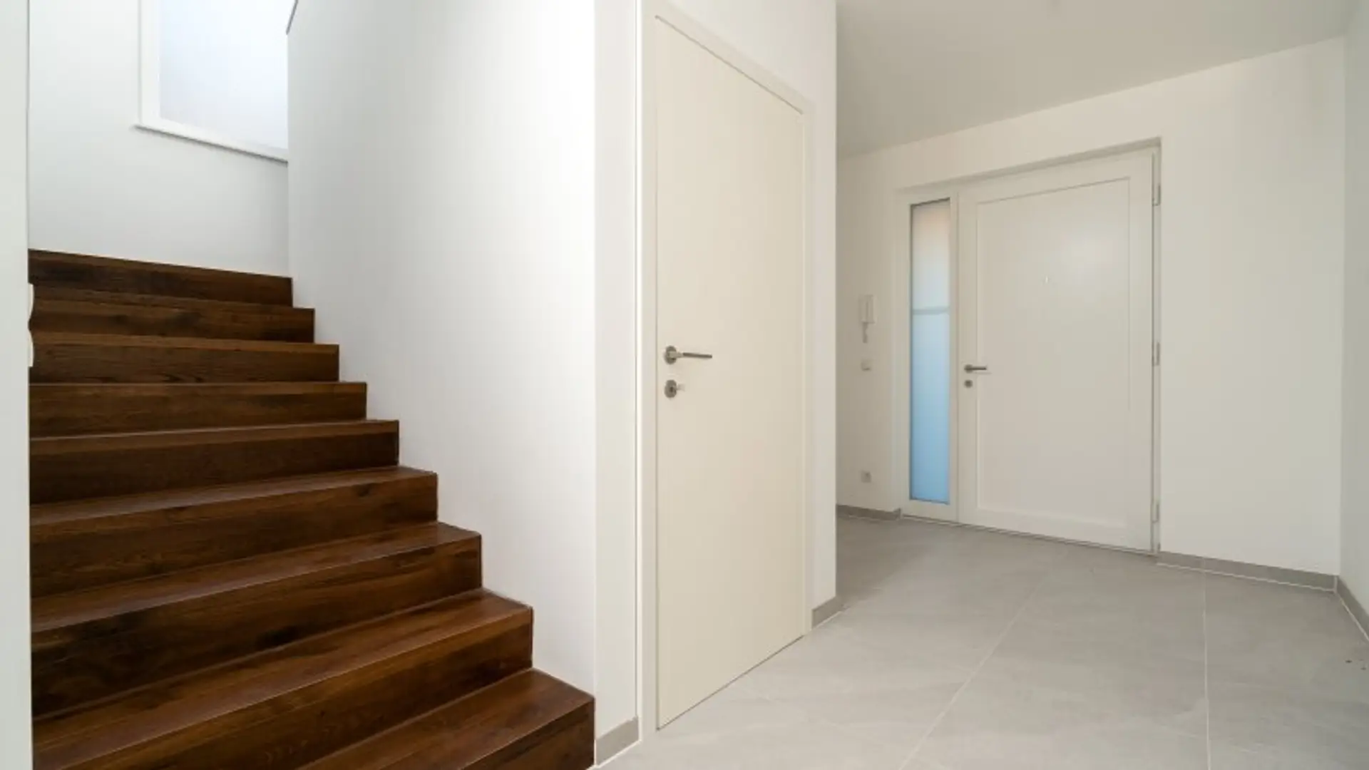 Beim Betreten des Hauses befindet sich rechterhand ein Garderobenbereich, am Ende davon ein WC mit Handwaschbecken. Linkerhand liegt das erste Zimmer, das sich ideal als Homeoffice oder Gästezimmer eignet. Ebenfalls auf dieser Seite befindet sich der Technikraum, in dem die hochwertige Haustechnik untergebracht ist. Unter der Treppe wurde zudem ein praktischer Abstellraum eingeplant.