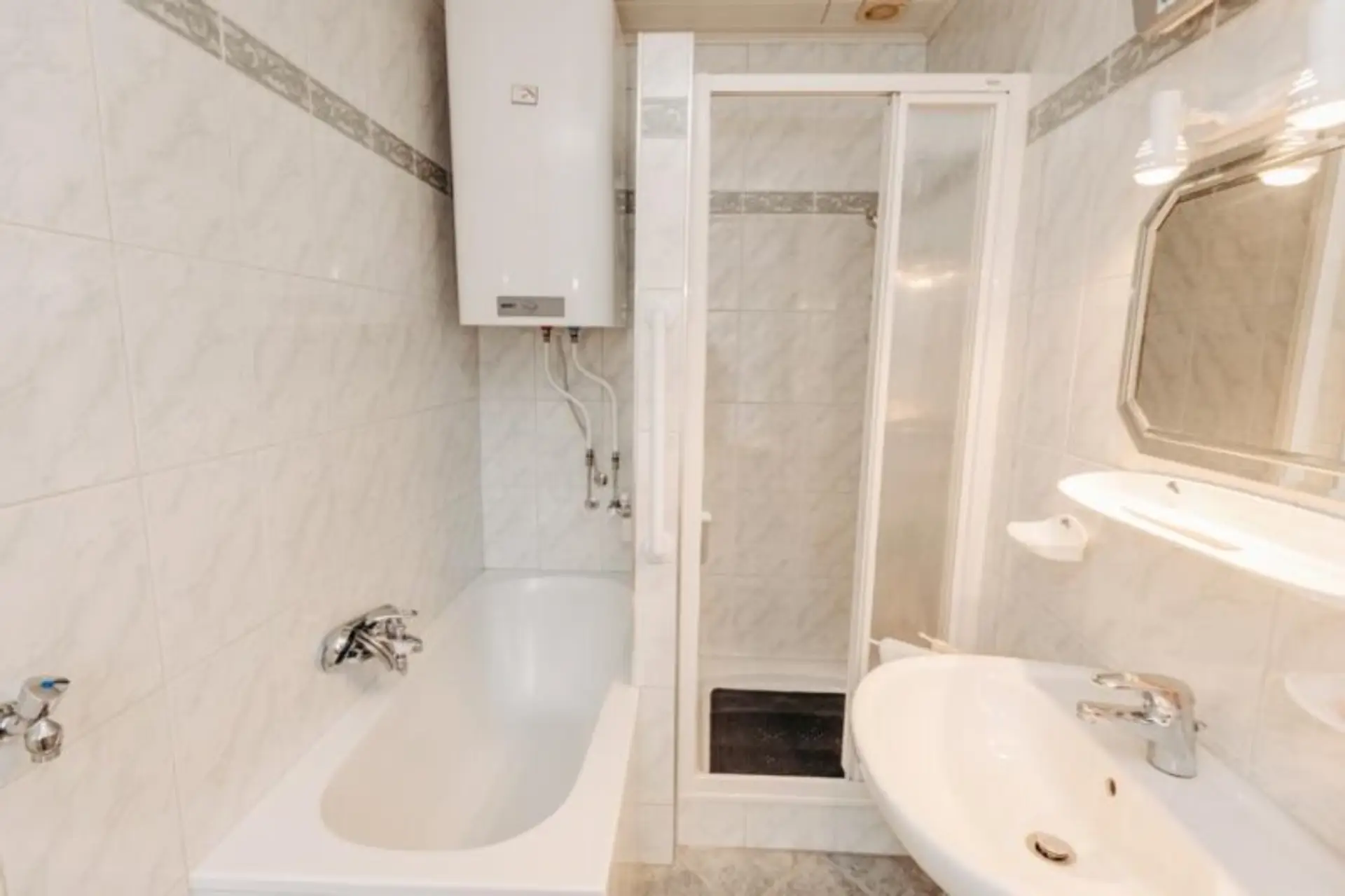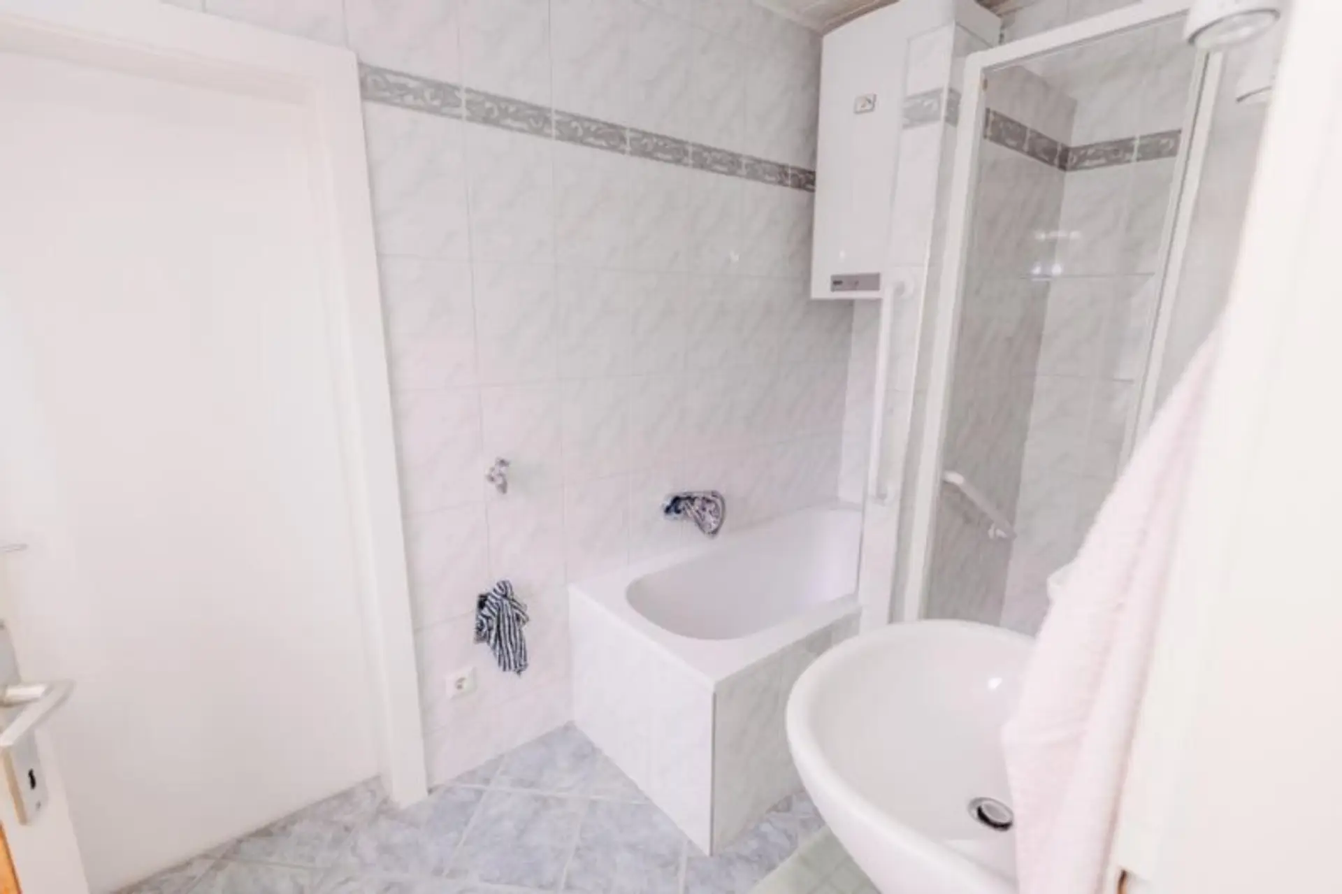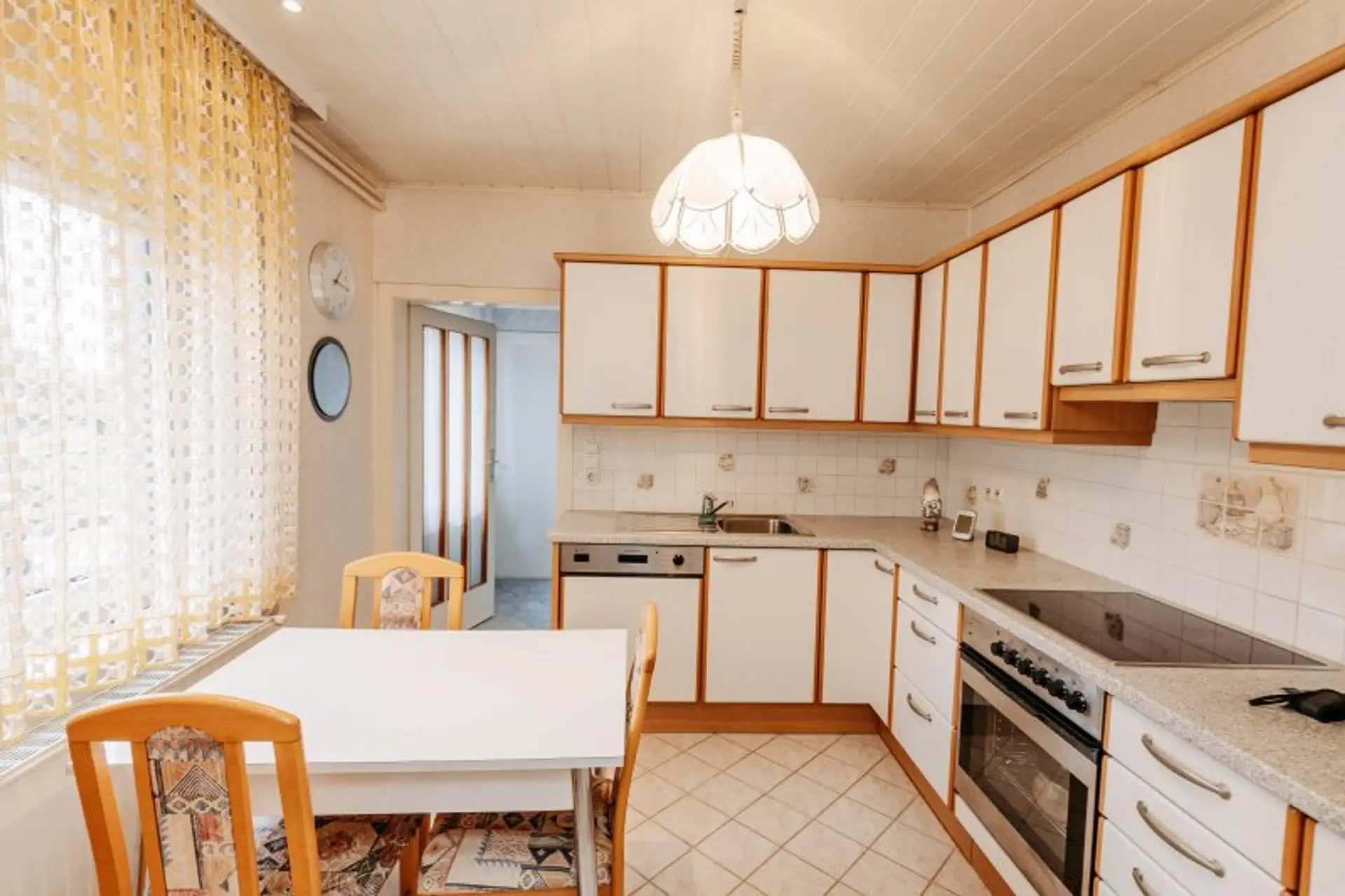 Diele, Wohn- Essbereich (Klebeparkett), Einbauküche, Bad (Wanne und Dusche), WC,
