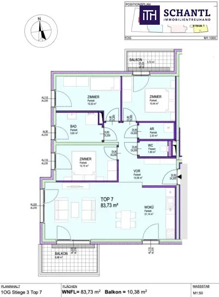 Wohnfläche: ca. 83,73 m² + 2 Balkon: ca. 10,38 m² + Kellerabteil