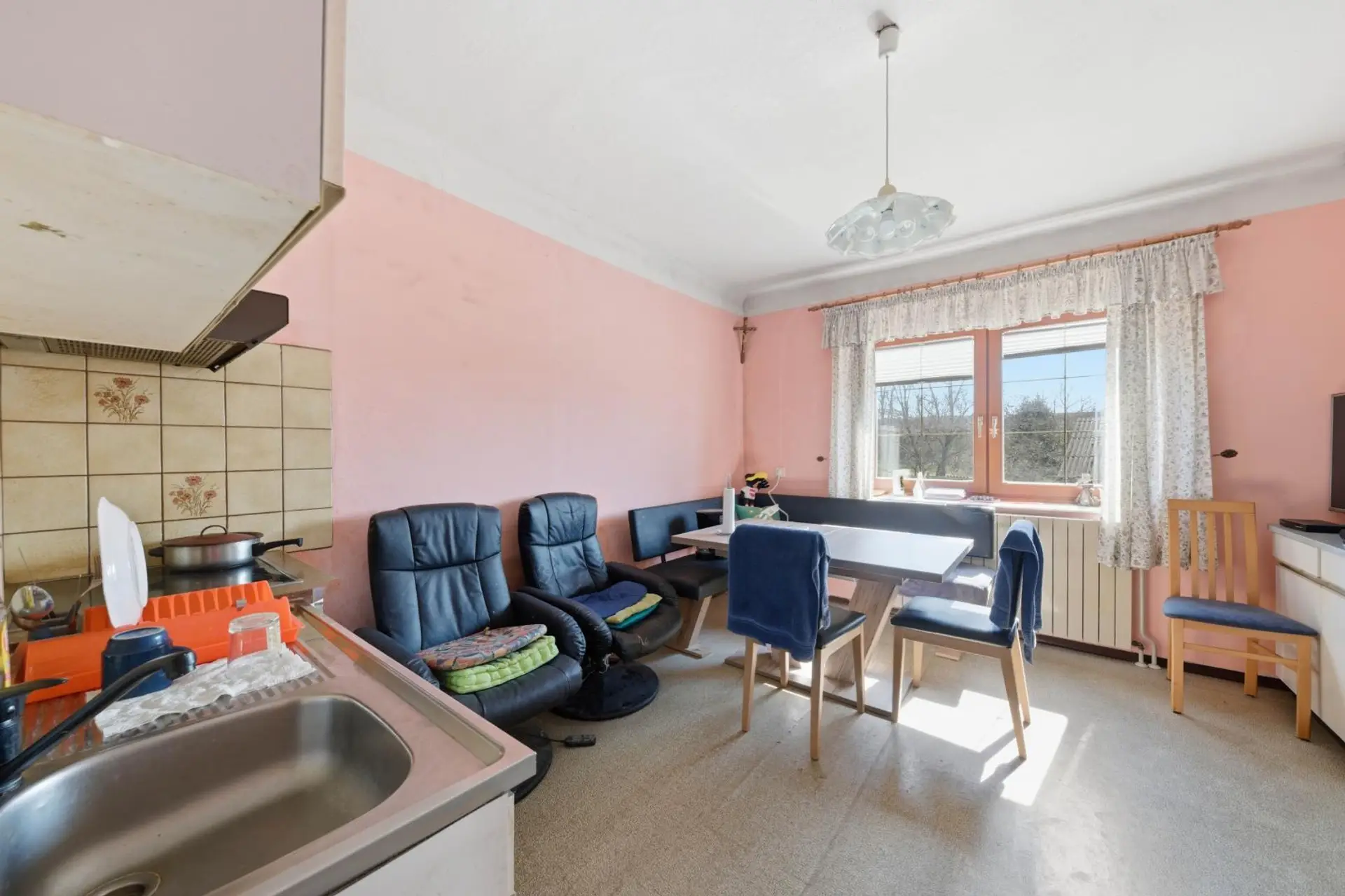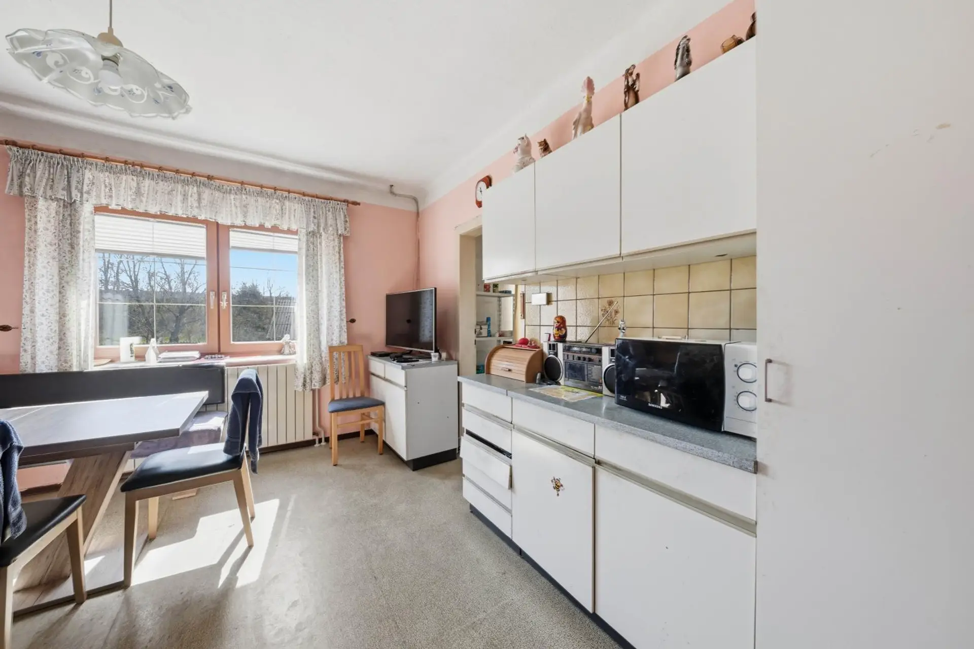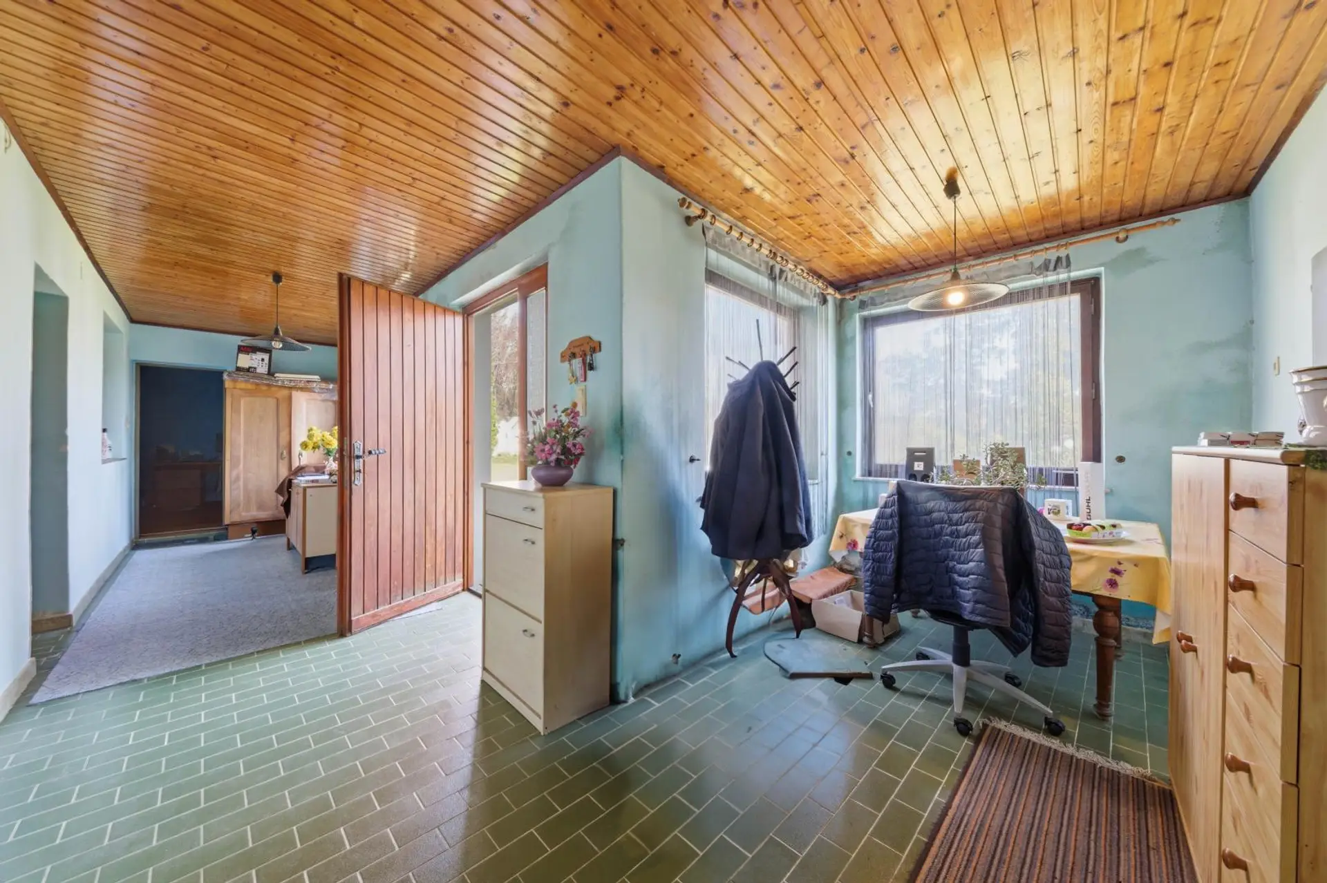 Im Obergeschoss befinden sich der Eingangsbereich, das Esszimmer mit Küche, das Wohnzimmer, zwei Schlafzimmer, ein Badezimmer, eine separate Toilette sowie ein weiteres Kabinett in einem später errichteten Zubau. Vom Eingangsbereich aus gelangt man direkt auf die sonnige Terrasse. Die Fenster sind aus PVC und zweifach verglast. Beheizt wird die Immobilie mittels Gas-Zentralheizung. Das Haus befindet sich in einem baulich soliden Zustand, bedarf jedoch einer Modernisierung, um den heutigen technischen und optischen Standards zu entsprechen.