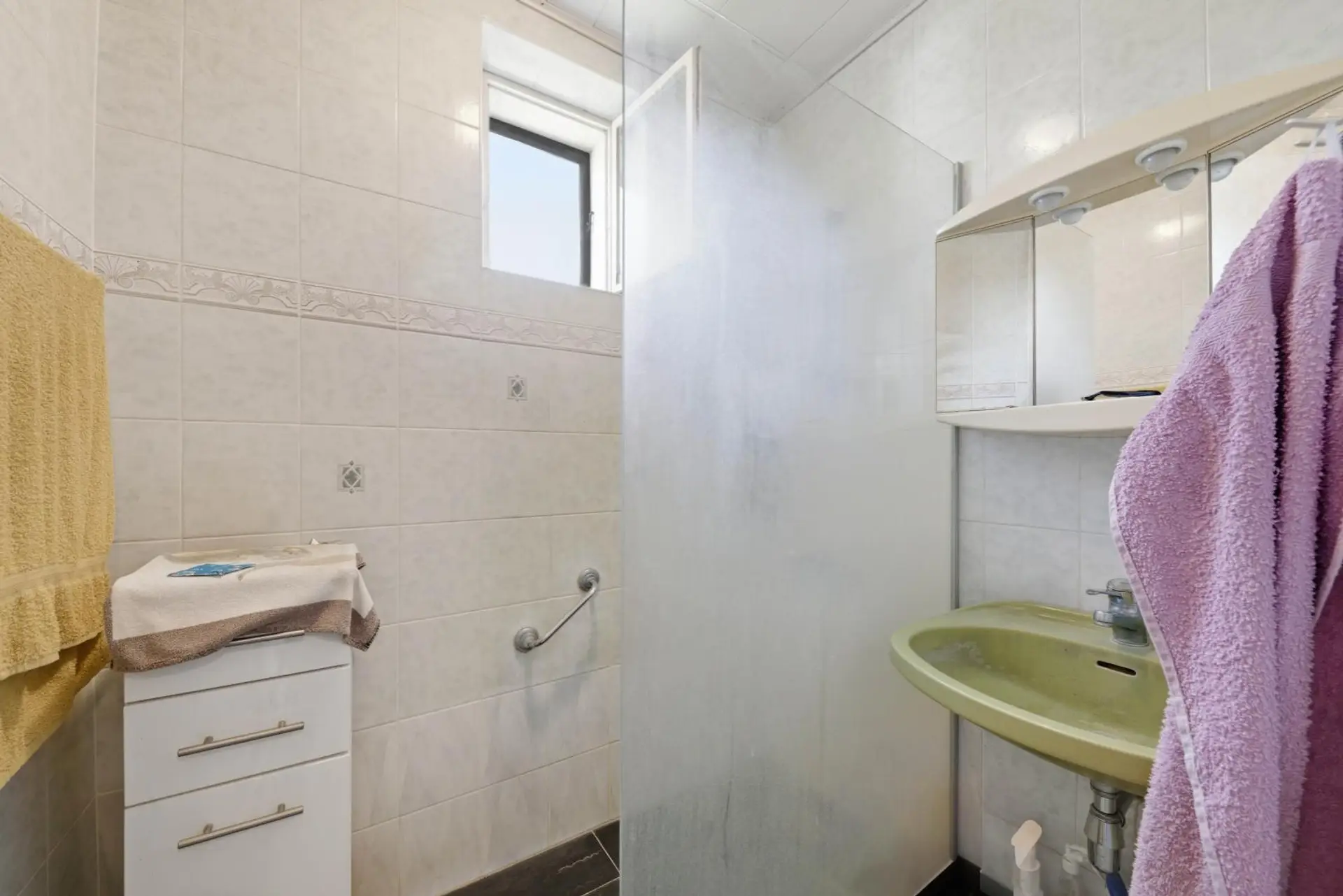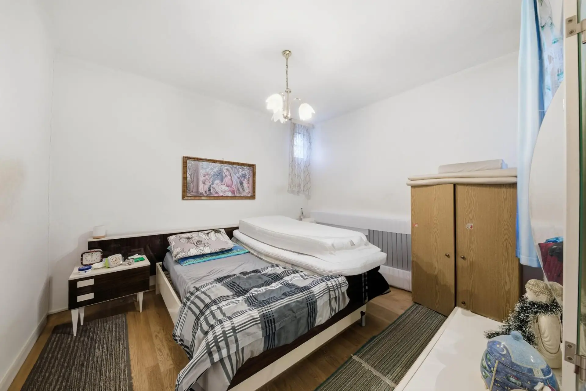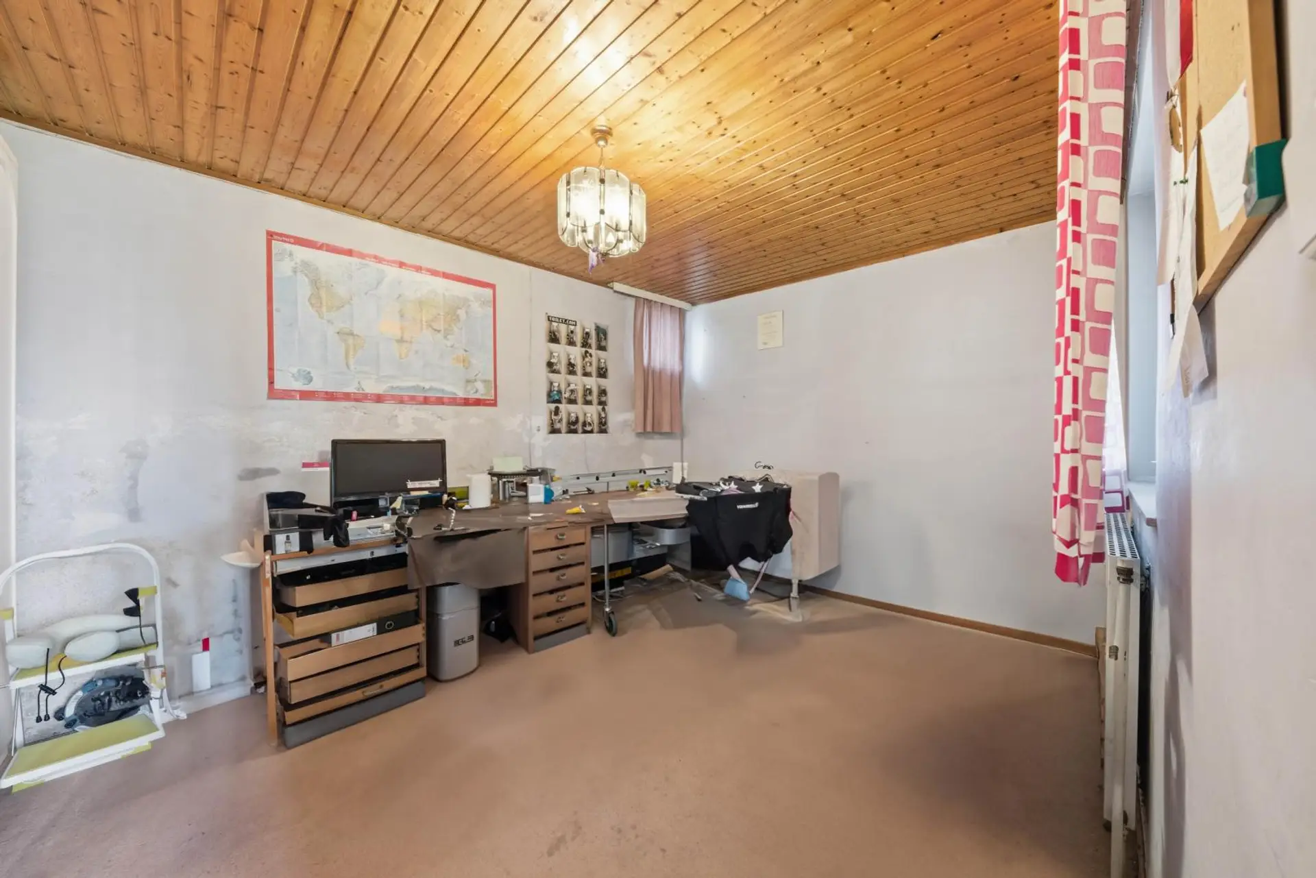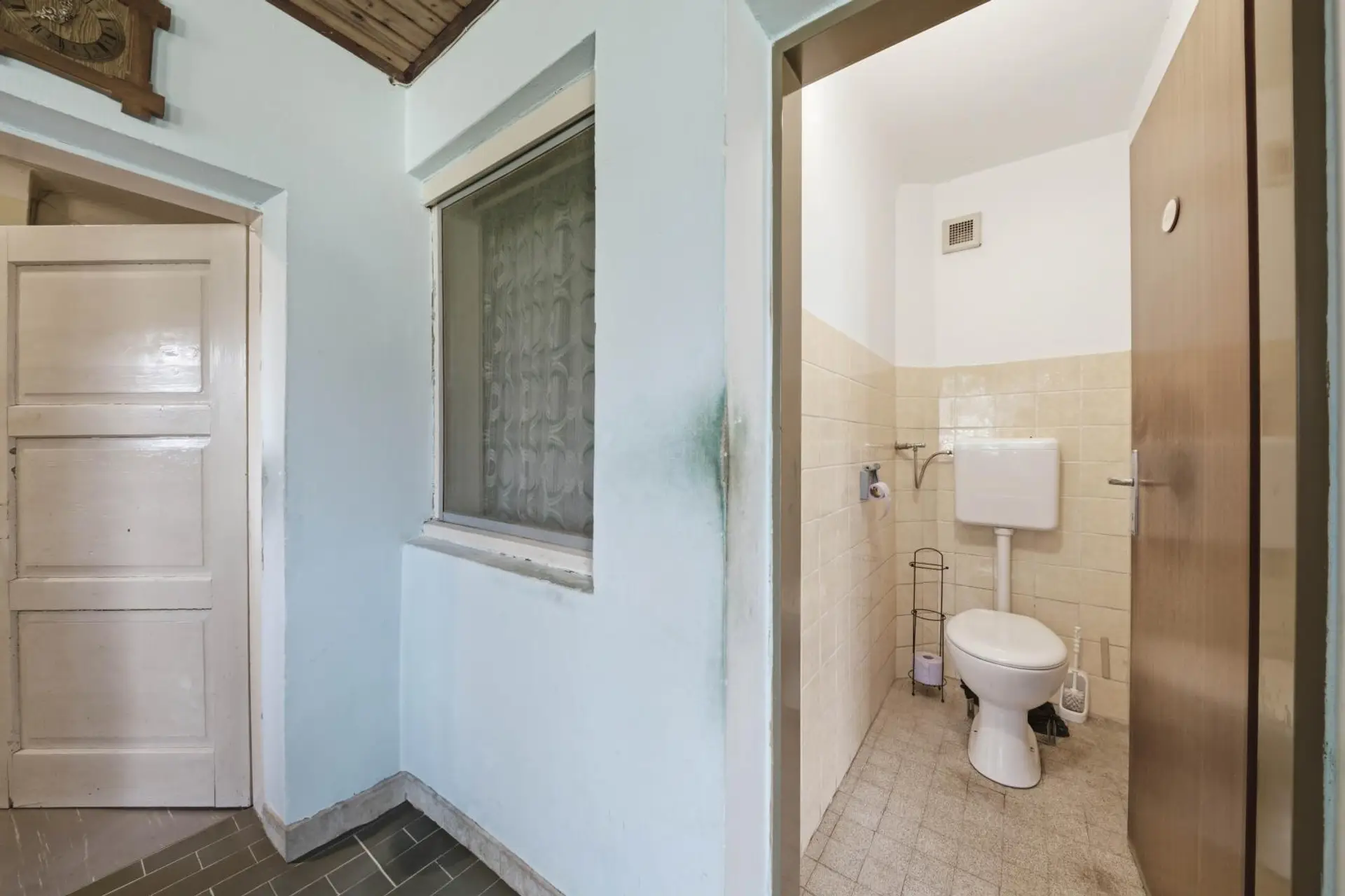 Im Obergeschoss befinden sich der Eingangsbereich, das Esszimmer mit Küche, das Wohnzimmer, zwei Schlafzimmer, ein Badezimmer, eine separate Toilette sowie ein weiteres Kabinett in einem später errichteten Zubau. Vom Eingangsbereich aus gelangt man direkt auf die sonnige Terrasse. Die Fenster sind aus PVC und zweifach verglast. Beheizt wird die Immobilie mittels Gas-Zentralheizung. Das Haus befindet sich in einem baulich soliden Zustand, bedarf jedoch einer Modernisierung, um den heutigen technischen und optischen Standards zu entsprechen.