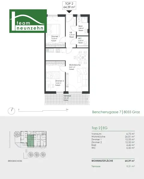 Die 3-Zimmer Wohnung mit ca. 64,39 m² Wohnfläche zzgl. ca. 9,51 m² Terrasse liegt im Erdgeschoss und gliedert sich in folgende tolle Raumaufteilung:
