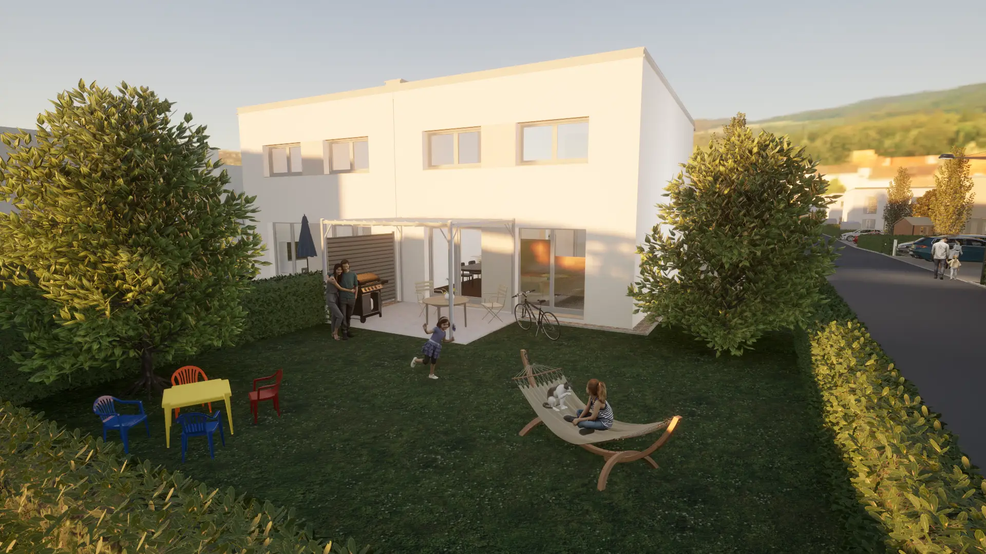 Die Wohlfühlhäuser überzeugen mit TOP-AUSSTATTUNG, gut durchdachter Raumaufteilung und qualitativ hochwertiger Holzmassivbauweise nach heutigem, besten Qualitätsstandard. Die Häuser weisen eine Nutzfläche von jeweils ca. 102,26m² bis ca. 141m² auf und verfügen über Terrassen, Eigengärten und jeweils zwei Parkplätze.