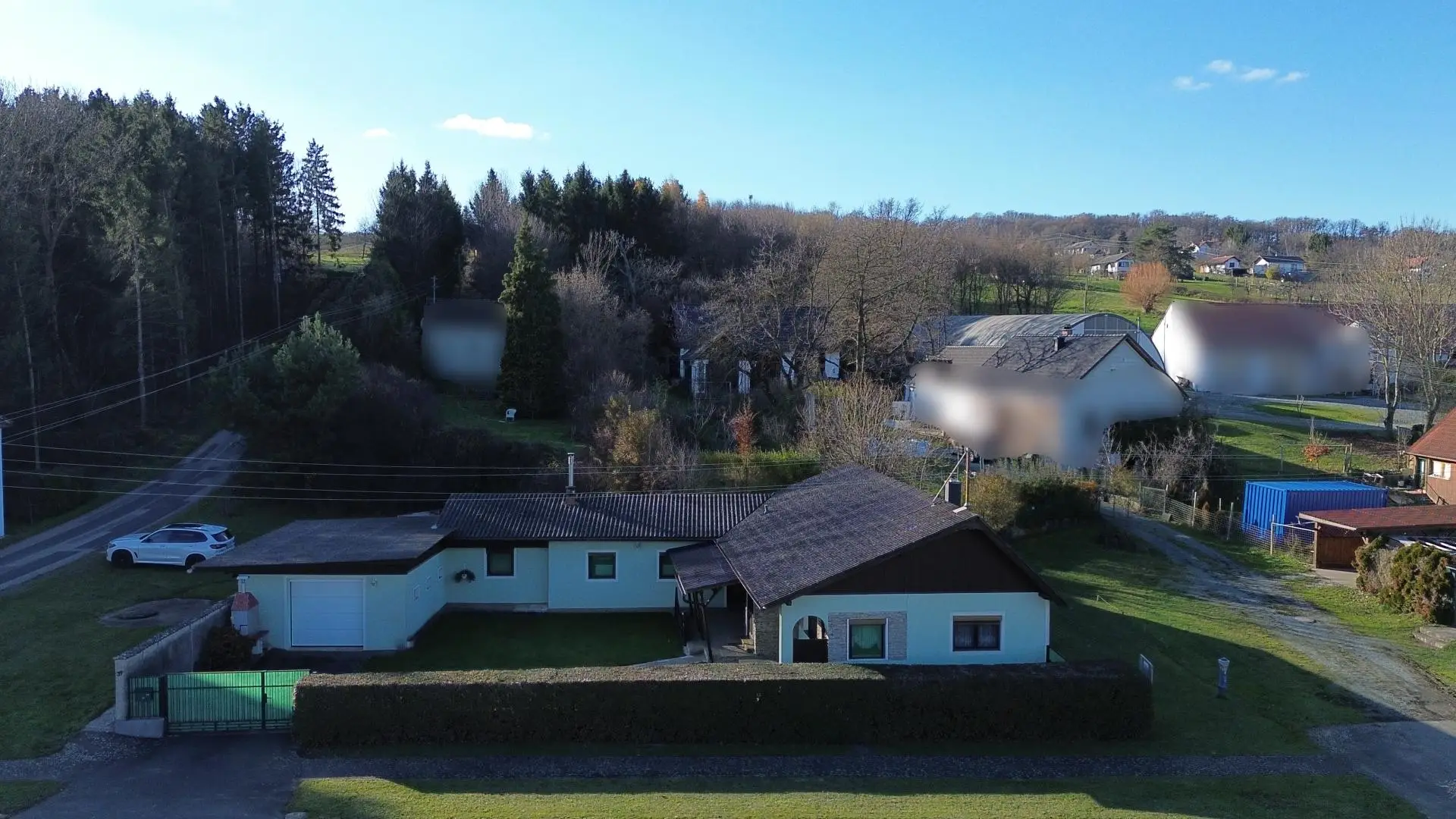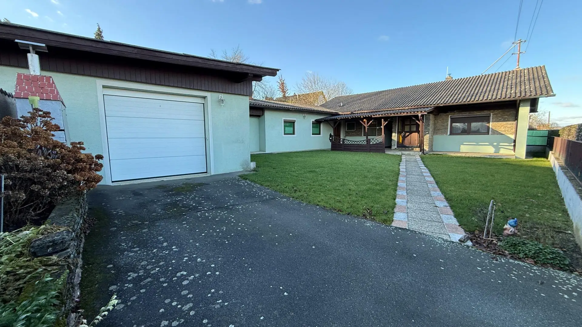 Die vorhandene Garage und das separate Holzlager erweitern die Nutzungsmöglichkeiten im Außenbereich zusätzlich.