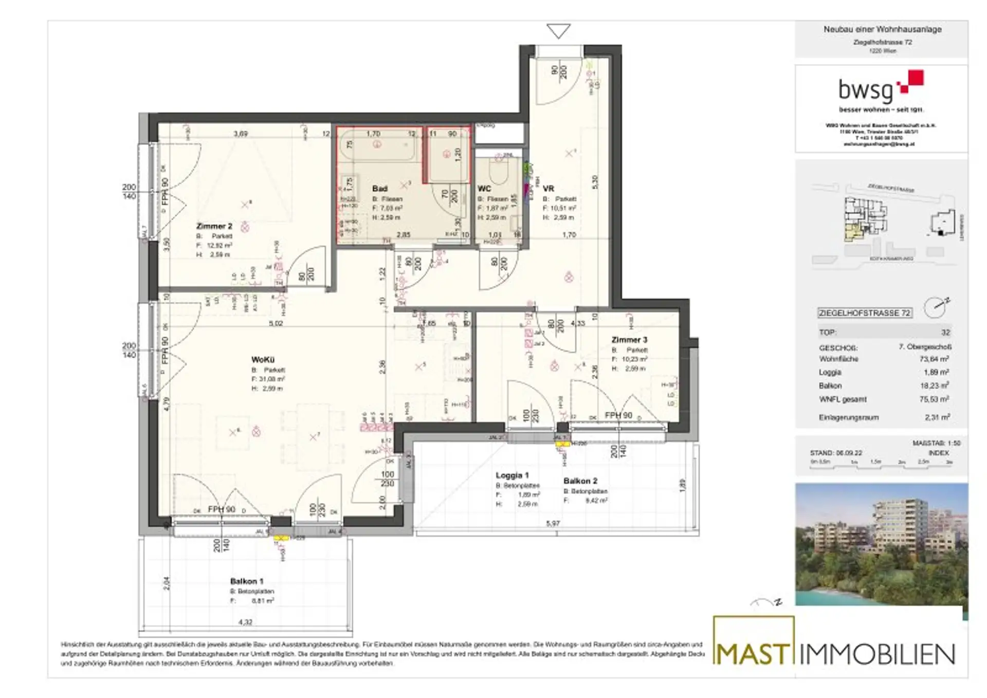 Die Wohnung befindet sich im 7. Obergeschoss und verfügt über 73,64 m² Wohnfläche + einen 8,81 m² großen Balkon und einen zweiten 11,31 m² großen Balkon/Loggia.