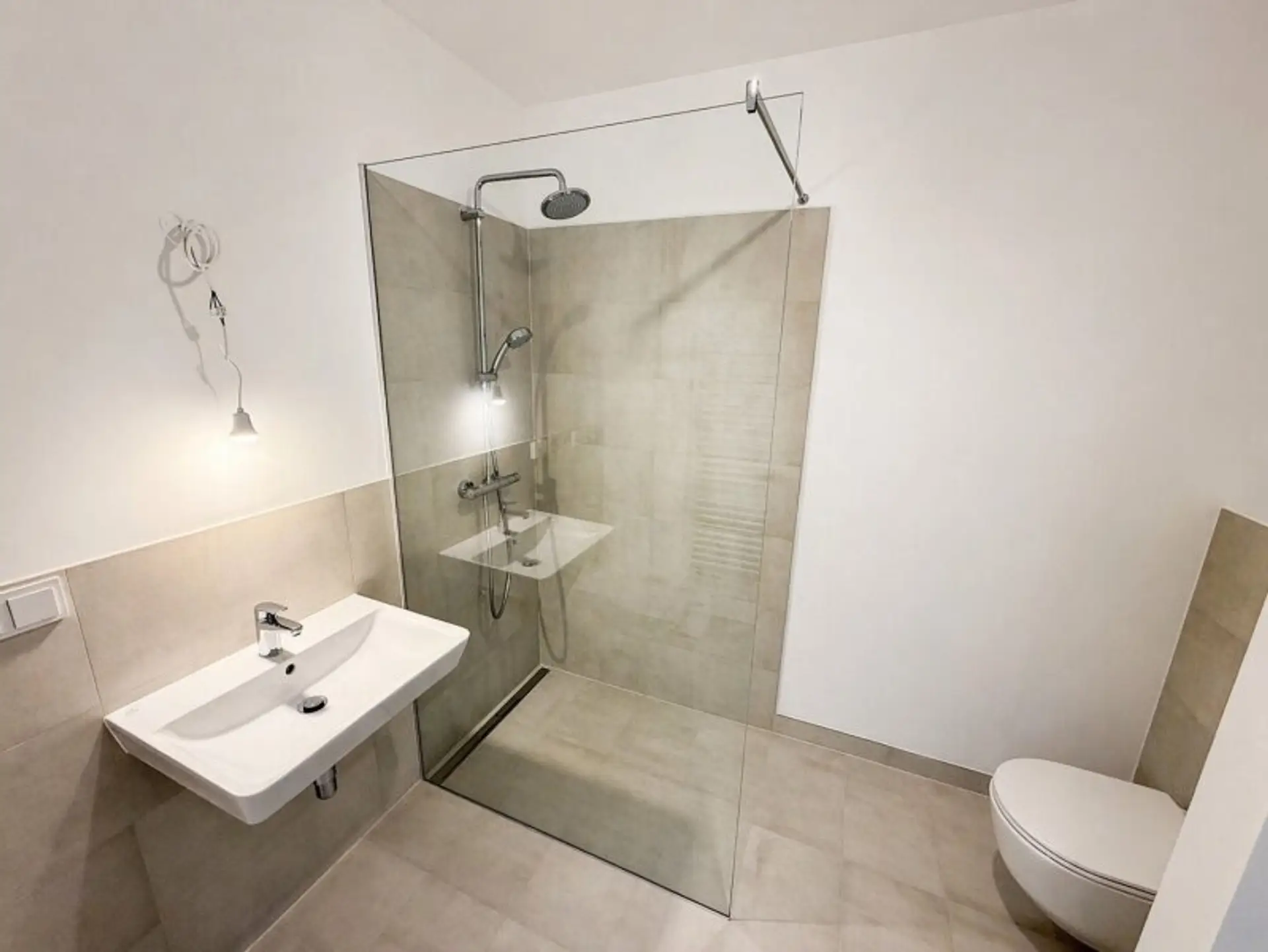 * Badezimmer mit bodenebener Dusche, Waschbecken, WC und WM-Anschluss