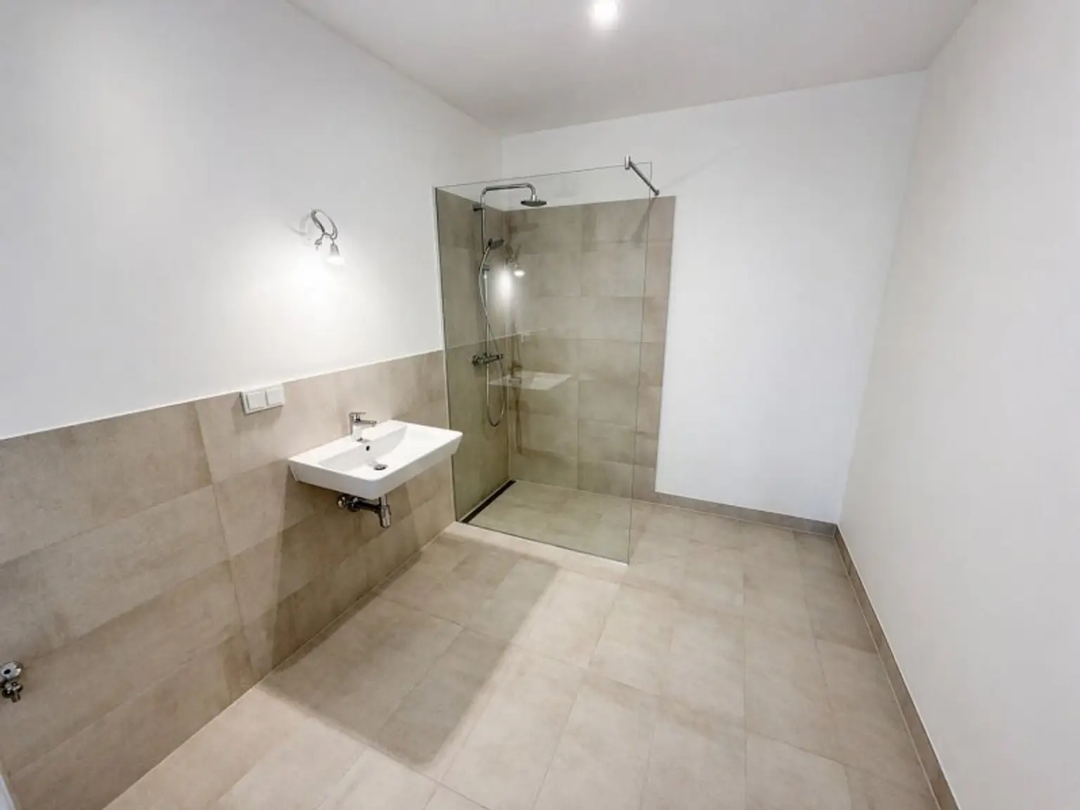 * Badezimmer mit bodenebener Dusche, Waschbecken und WM-Anschluss