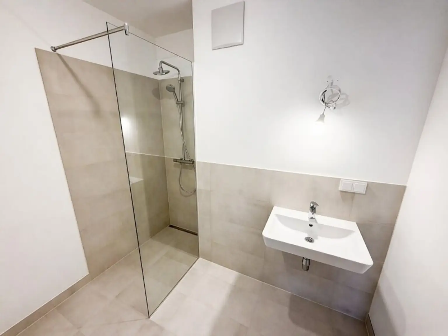 * Badezimmer mit bodenebener Dusche, Waschbecken und WM-Anschluss