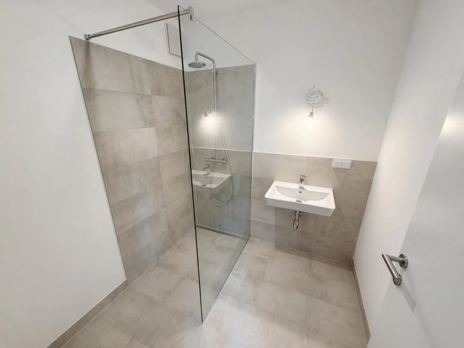 * Badezimmer mit bodenebener Dusche, Waschbecken und WM-Anschluss