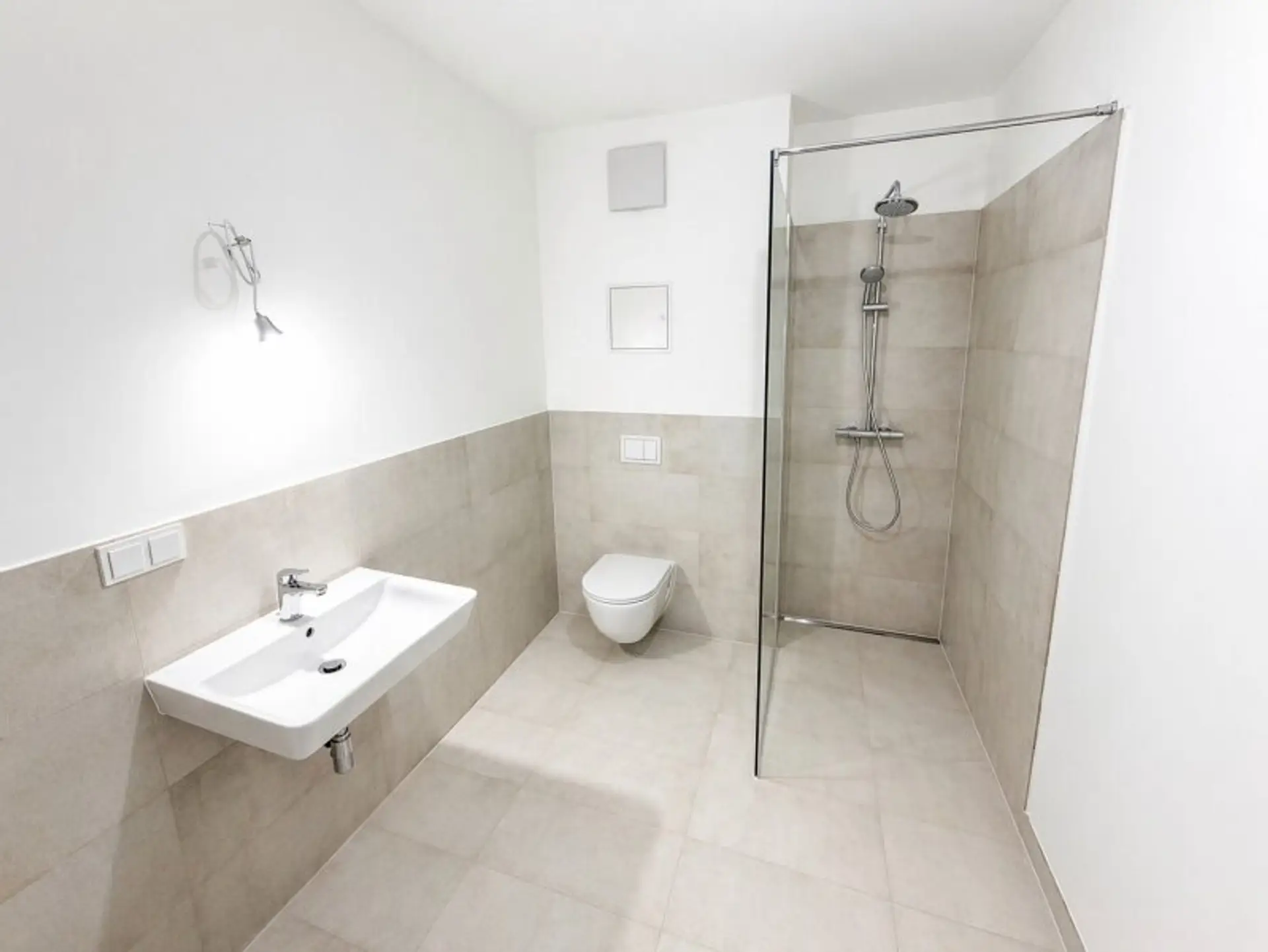 * Badezimmer mit bodenebener Dusche, Waschbecken, WC und WM-Anschluss