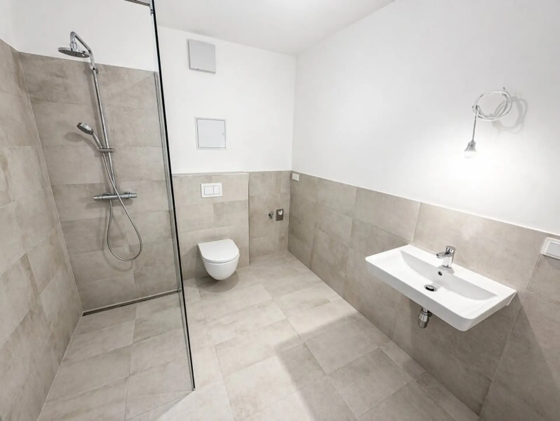 * Badezimmer mit bodenebener Dusche, Waschbecken, WC und WM-Anschluss