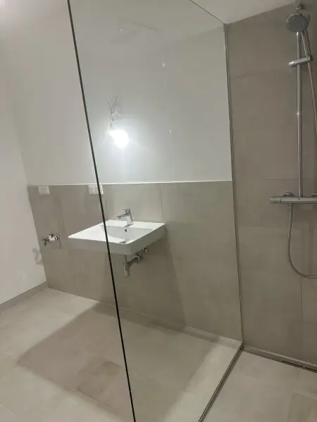 * Badezimmer mit bodenebener Dusche, Waschbecken und WM- Anschluss