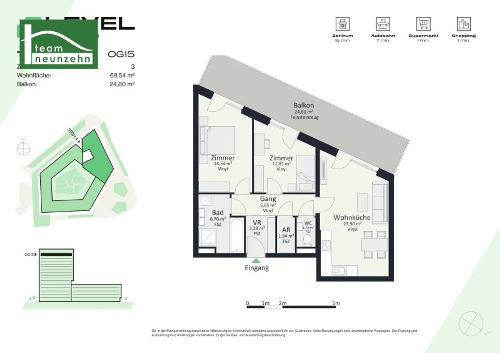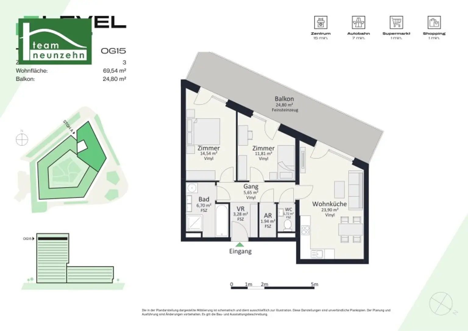 Die Wohnung befindet sich im 15. Obergeschoss und hat folgende Raumaufteilung: