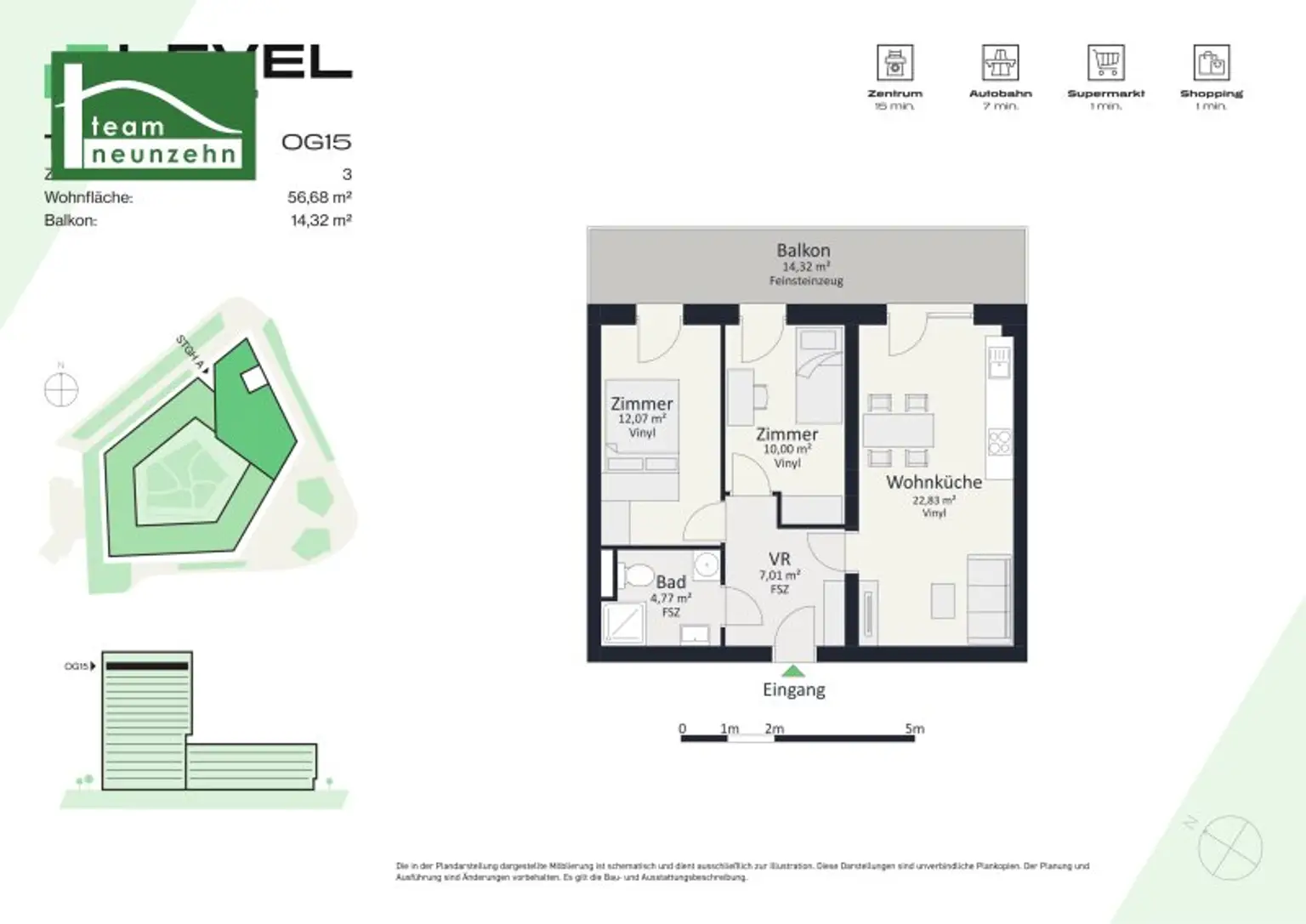 Die Wohnung befindet sich im 15. Obergeschoss und hat folgende Raumaufteilung: