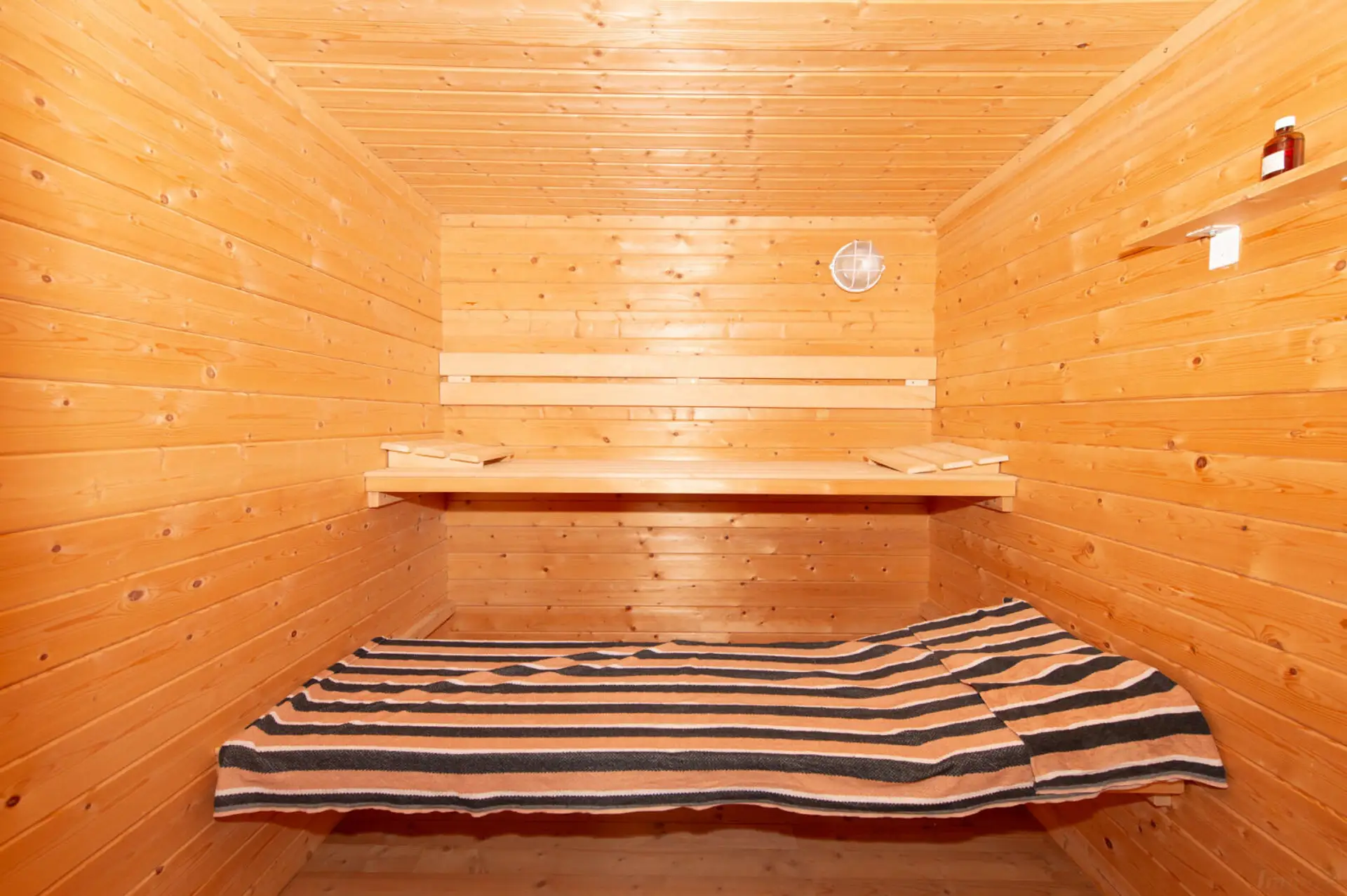 Fitnessraum mit Sauna lädt zum Entspannen ein, während