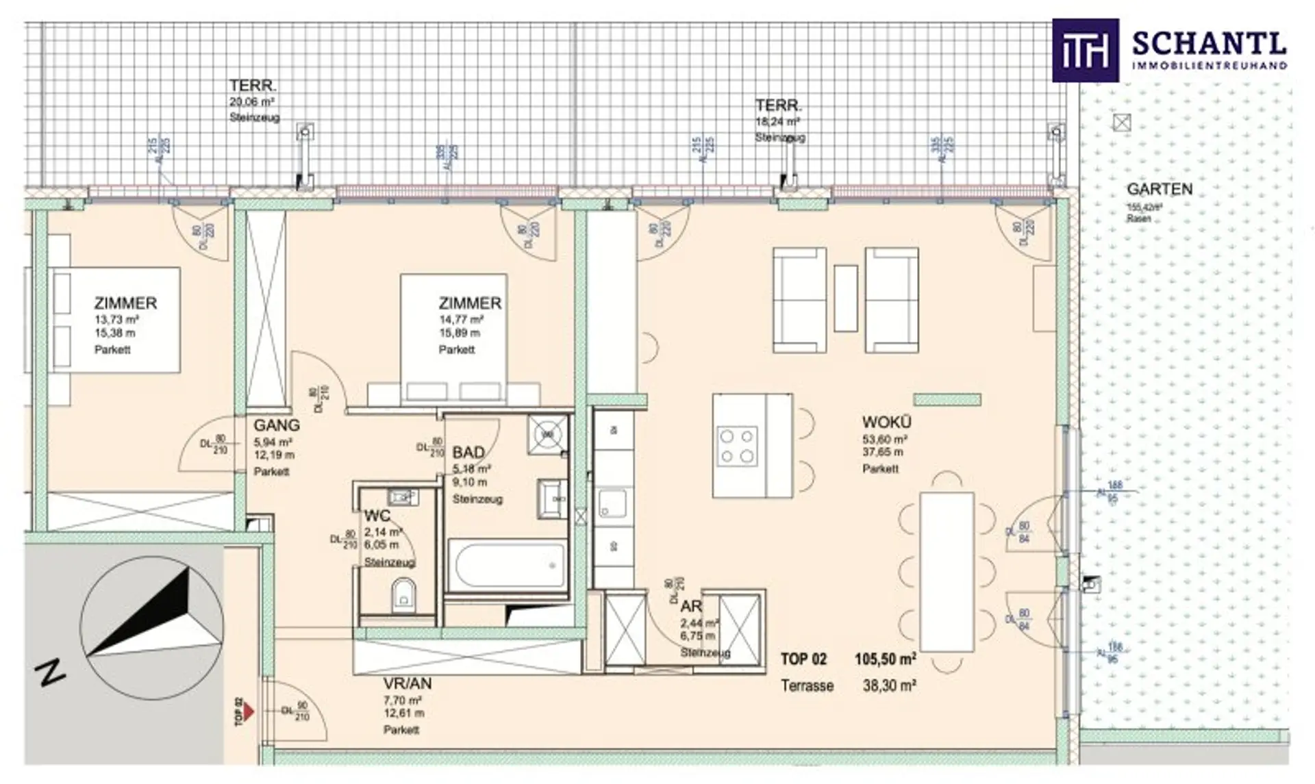 Wohnfläche: ca. 105,50 m² + Terrasse: ca. 38,30 m² + Garten: ca. 155 m² + Kellerabteil