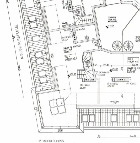 Die exquisite ca. 188 m² DG-Maisonette, mit ca. 58 m² Terrassenfläche erstreckt sich über 3 Ebenen (lt. Eigentümer wurden Ebene 2 und 3 ca. 2004 aufgestockt).