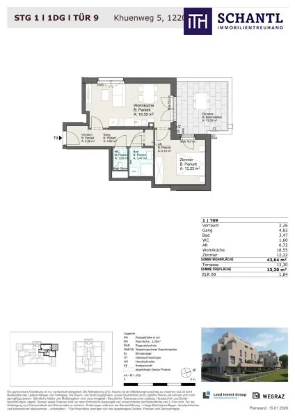 Wohnfläche: ca. 43,64m² + Terrasse: ca. 13,30m² + Kellerabteil: ca. 1,84m²