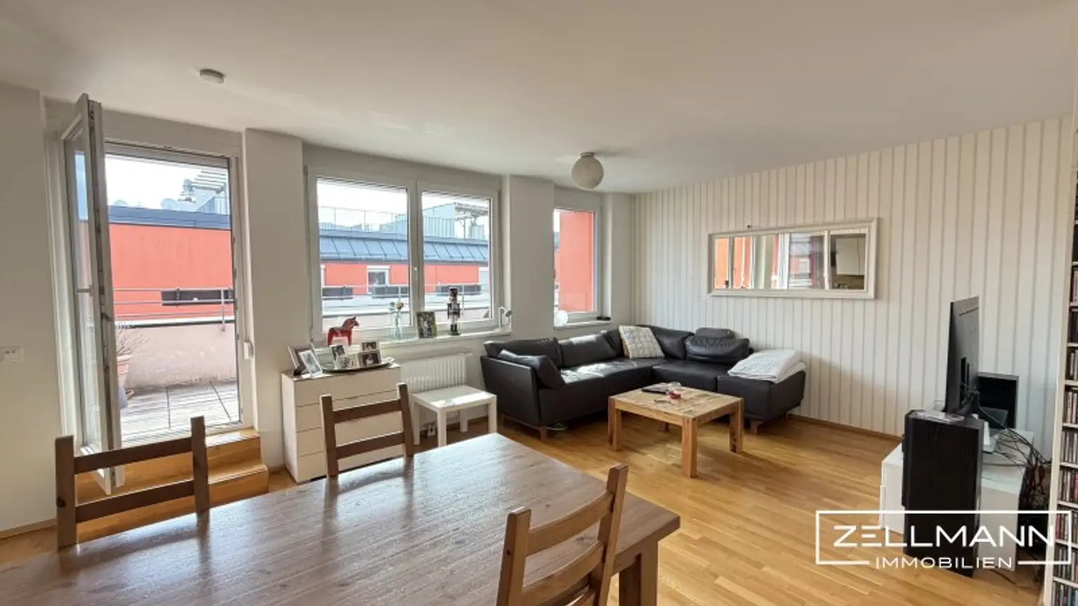 Der zentrale Wohnbereich bildet das Herzstück der Wohnung. Großzügige Fensterflächen sorgen für eine helle, offene Atmosphäre und schaffen eine angenehme Verbindung zwischen Innen- und Außenraum.