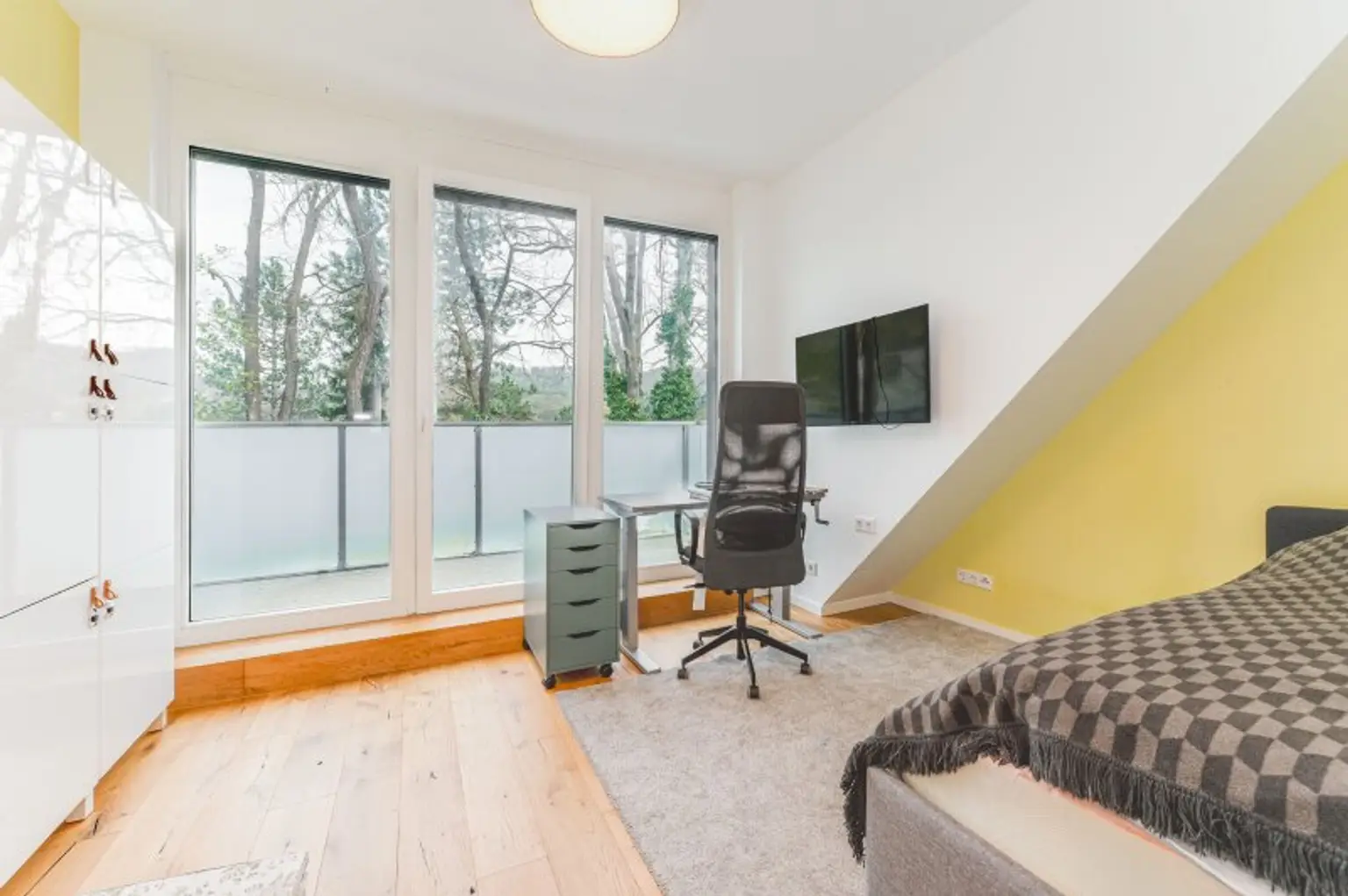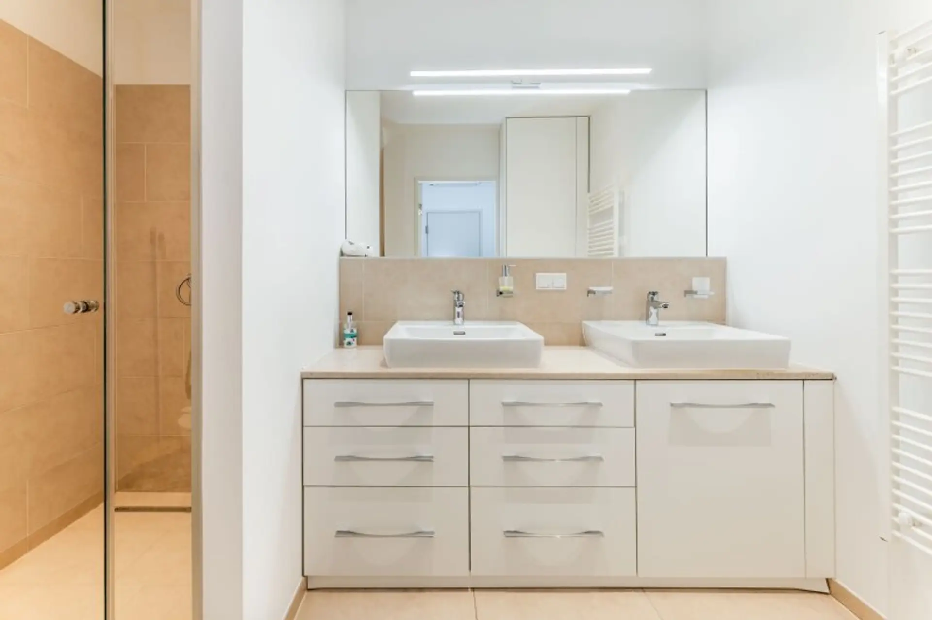 Die Wohnung verfügt über insgesamt drei Schlafzimmer. Zwei der Zimmer sind ideal als Kinder- oder Gästezimmer geeignet und bieten jeweils Zugang zu eigenen Außenflächen (Balkon bzw. Terrasse). Das Master-Bedroom überzeugt mit einem eigenen Badezimmer en-suite sowie einem separaten WC und bietet somit höchsten Wohnkomfort. Ergänzt wird das Raumangebot durch ein weiteres, großzügiges Badezimmer mit Doppelwaschbecken, Badewanne und WC sowie einen praktischen Schrankraum.