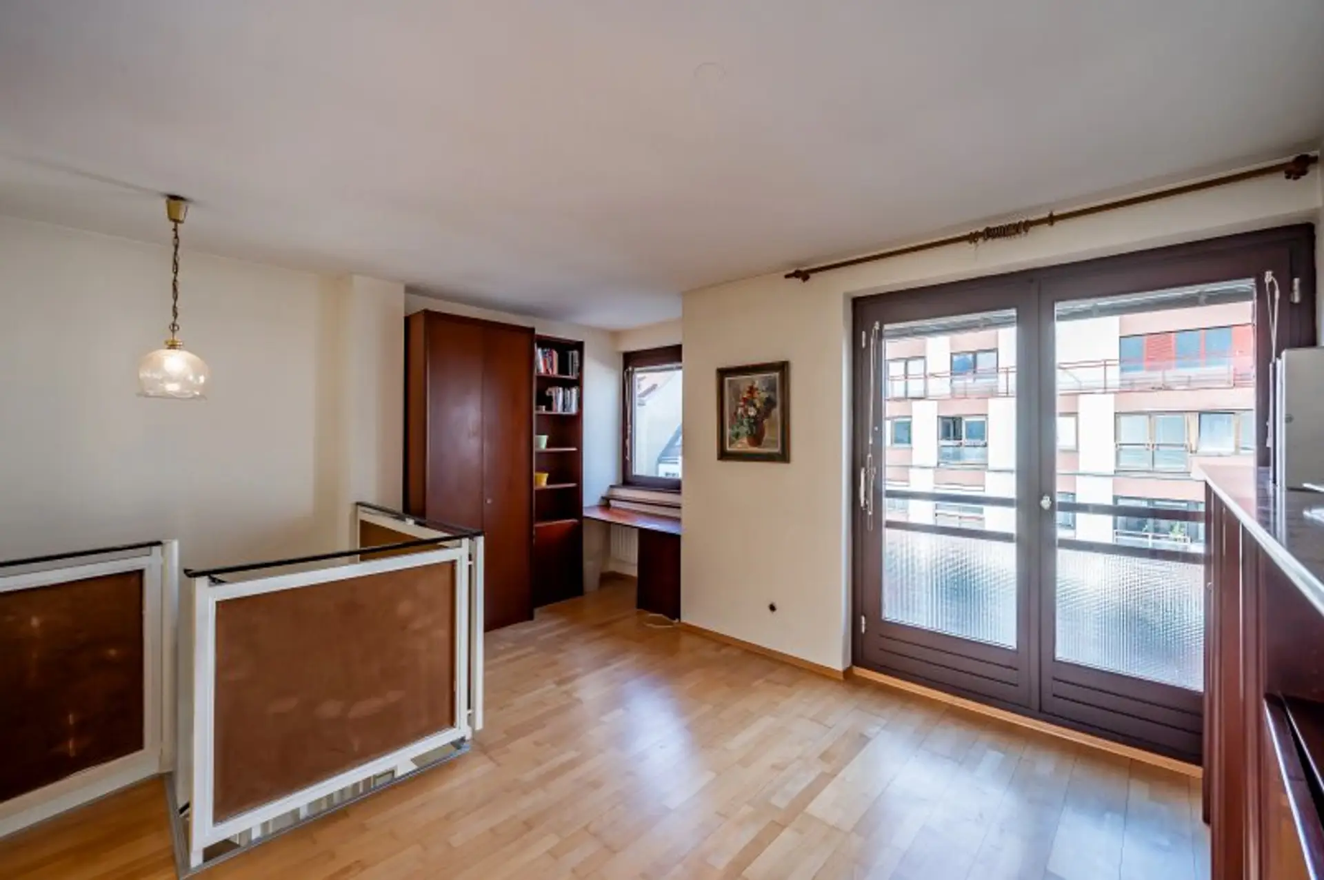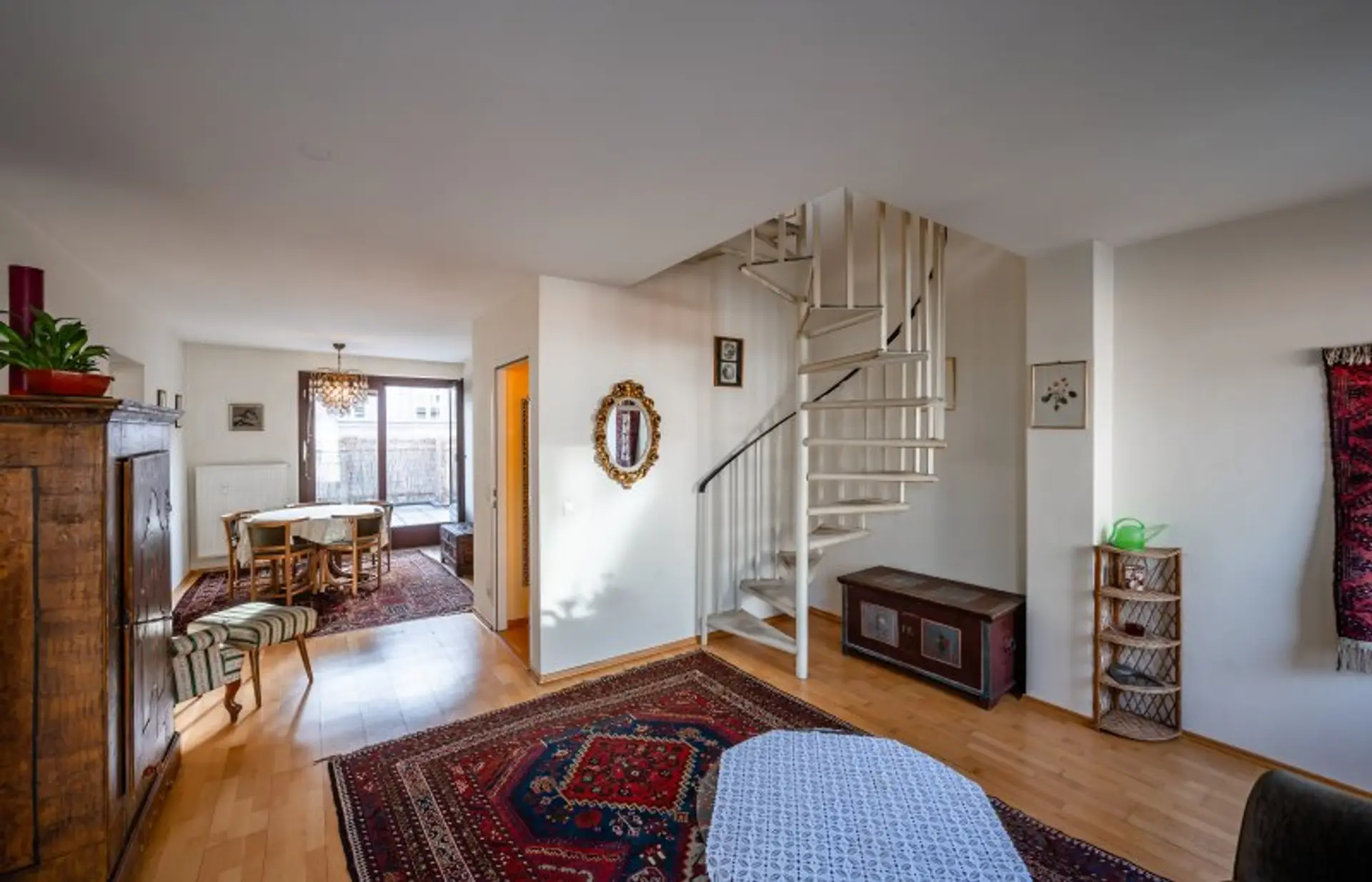 Die Wohnung verfügt über eine Wohnfläche von ca. 106 m2 sowie je ca. 22 m2 Terrassenfläche pro Wohnebene. Der derzeitige Grundriss bietet mehrere Optionen zur individuellen Neugestaltung. Aktuell bietet die Wohnung eine große Küche, ein geräumiges Wohn-/Esszimmer, zwei Schlafzimmer, eine Bibliothek, zwei Badezimmer und Nebenräume.