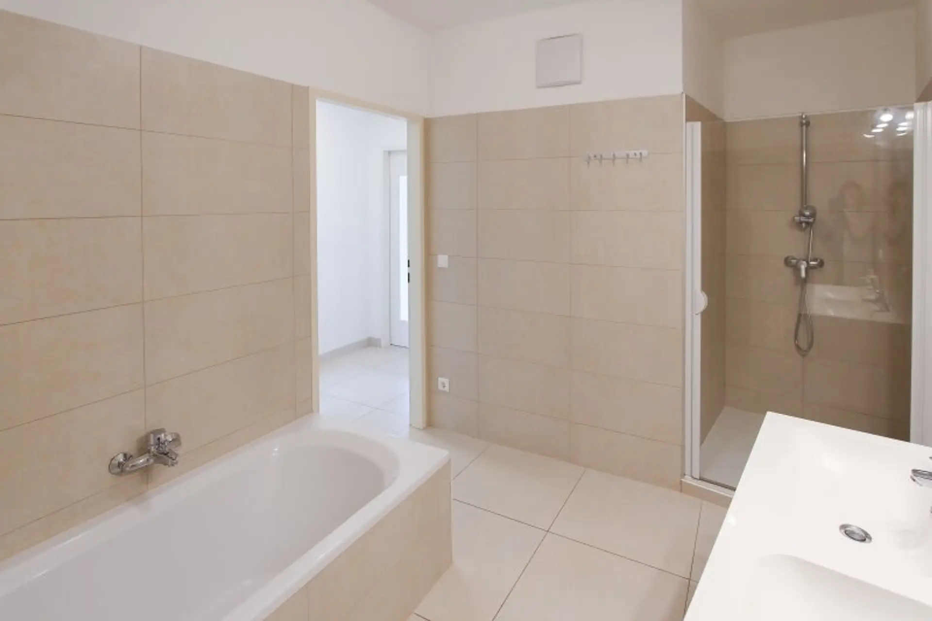 Das geräumige Badezimmer ist mit einer Badewanne, einer Walk-In-Dusche sowie einem Doppelwaschbecken ausgestattet. Ergänzt wird das Platzangebot durch einen praktischen Abstellraum sowie eine Garderobe, die zusätzlichen Stauraum bieten.