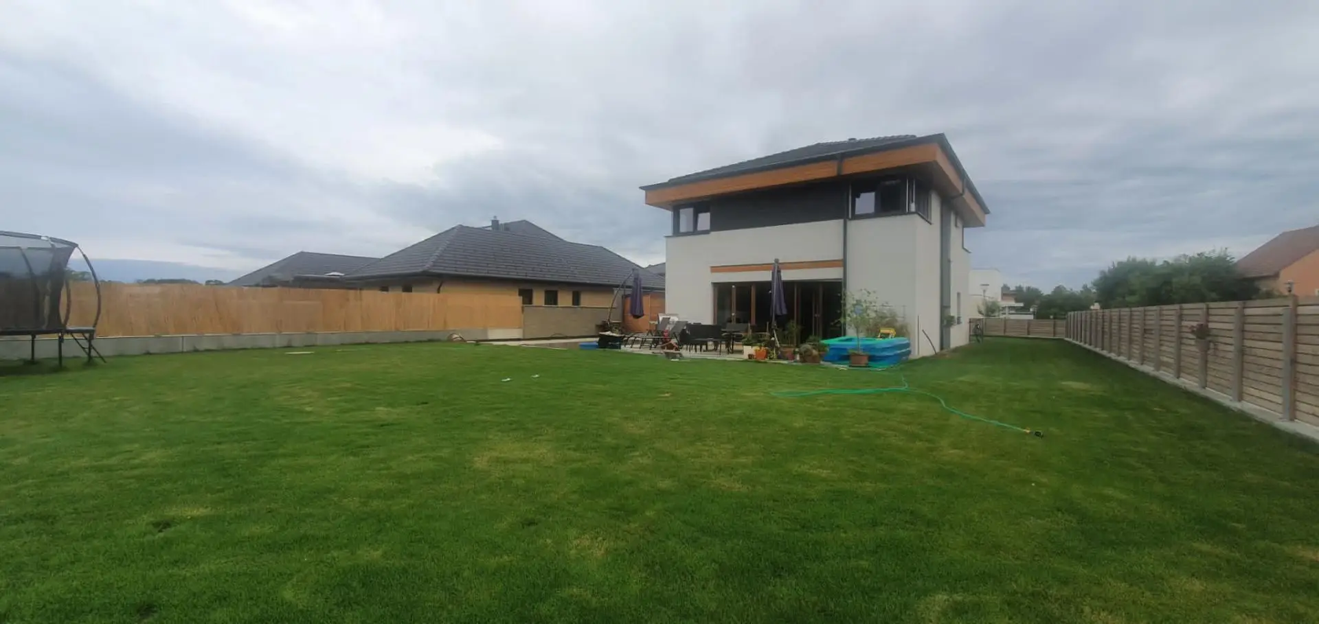 Der Garten ist komplett eingezäunt, dort findet man noch eine Garage, ein Carport, einen Abstellraum und eine Vorbereitung für ein Schwimmbad.