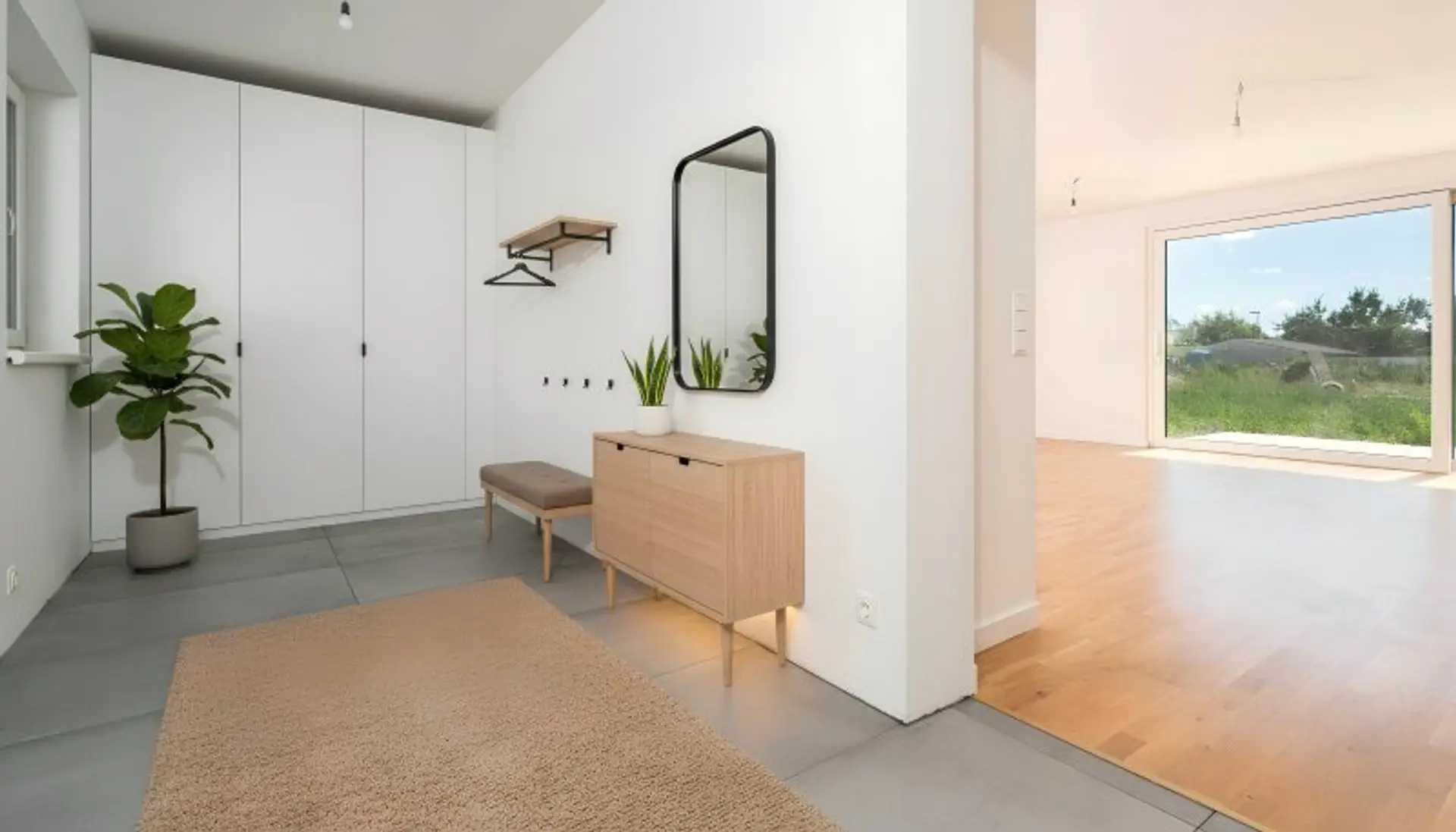 Über den Garten oder auch durch eine Überdachung vor dem Haus gelangt man in die Garage und den Technikraum des Objektes. Hier findet Ihr PKW sein Zuhause.