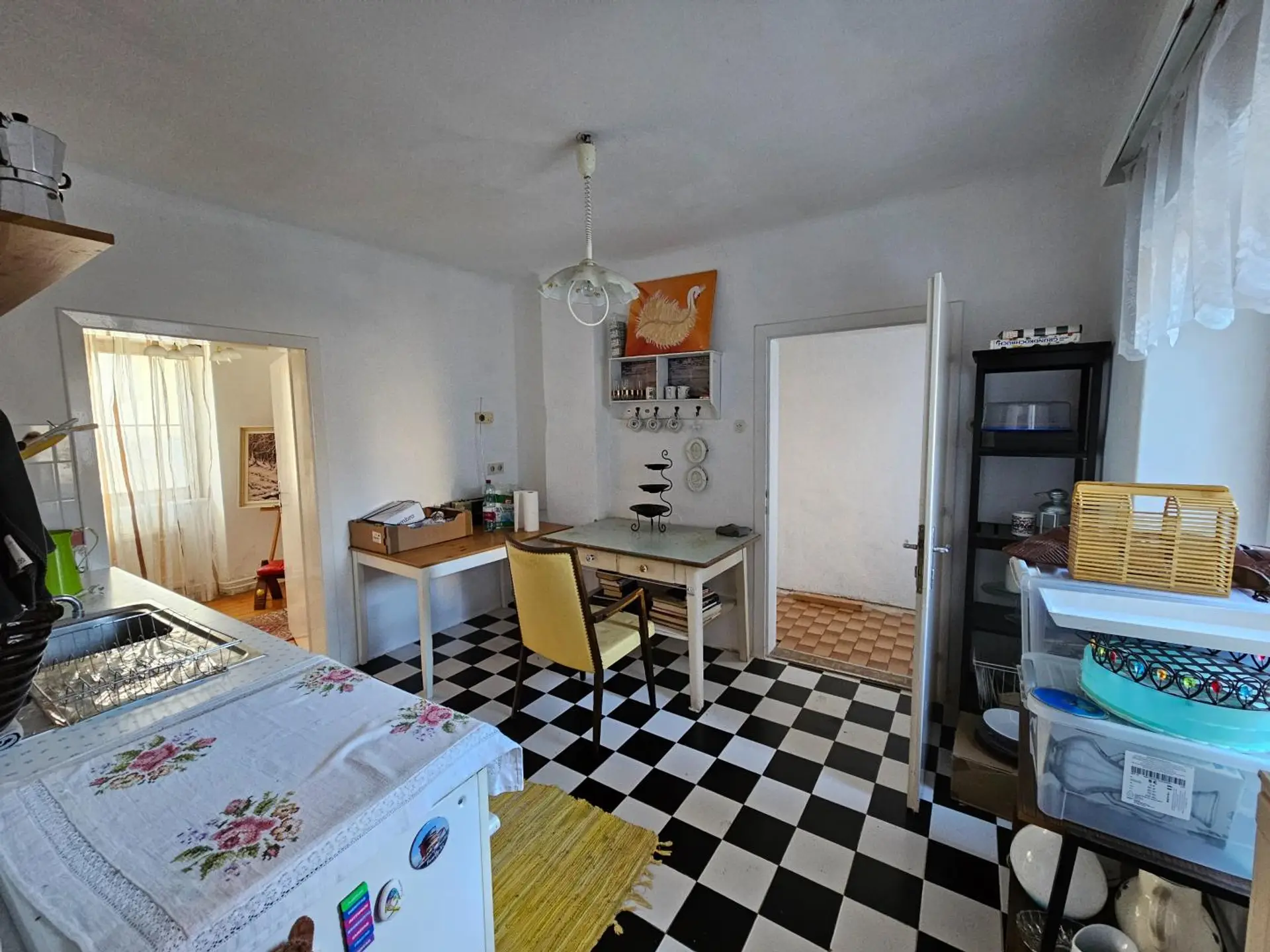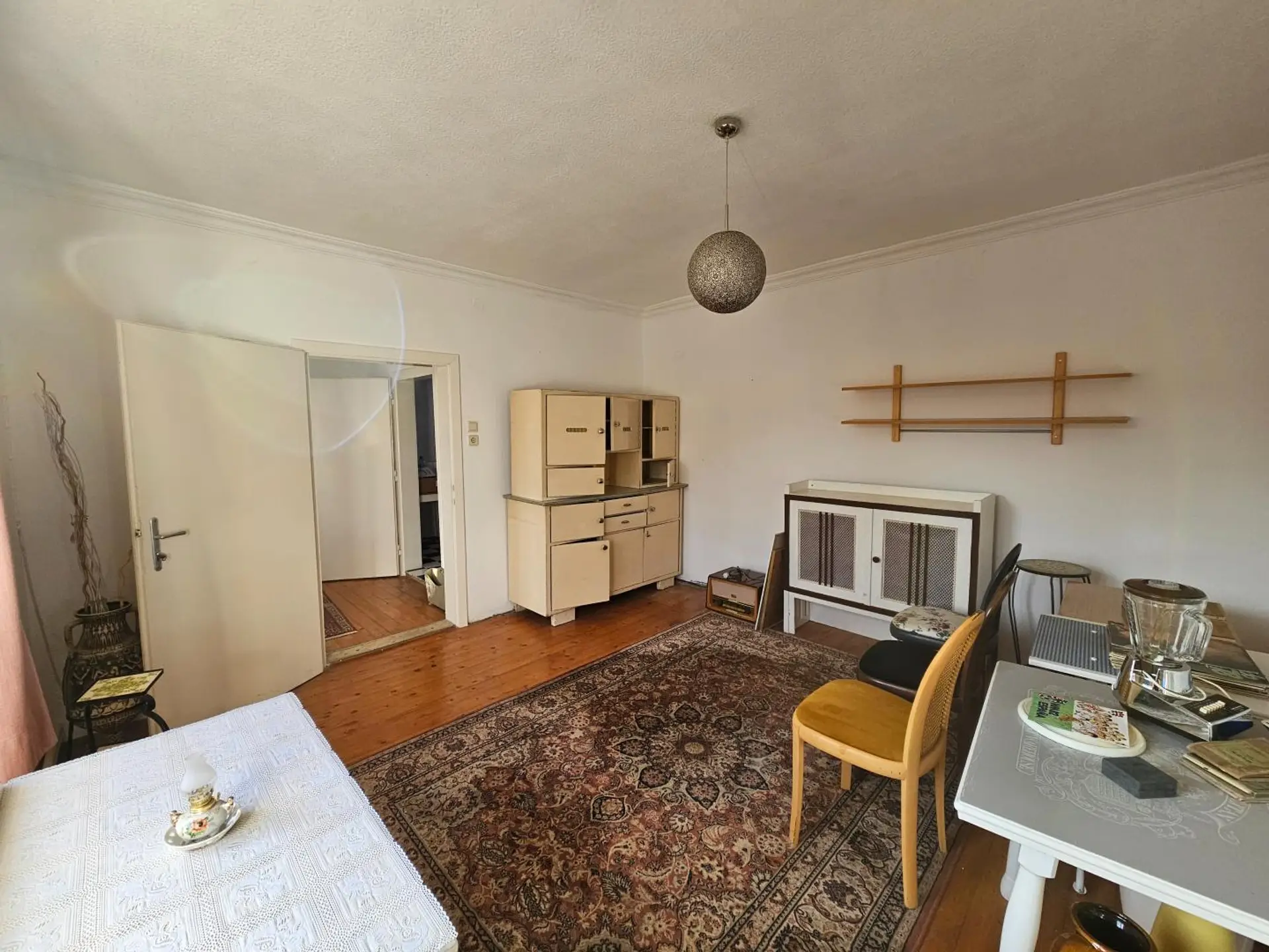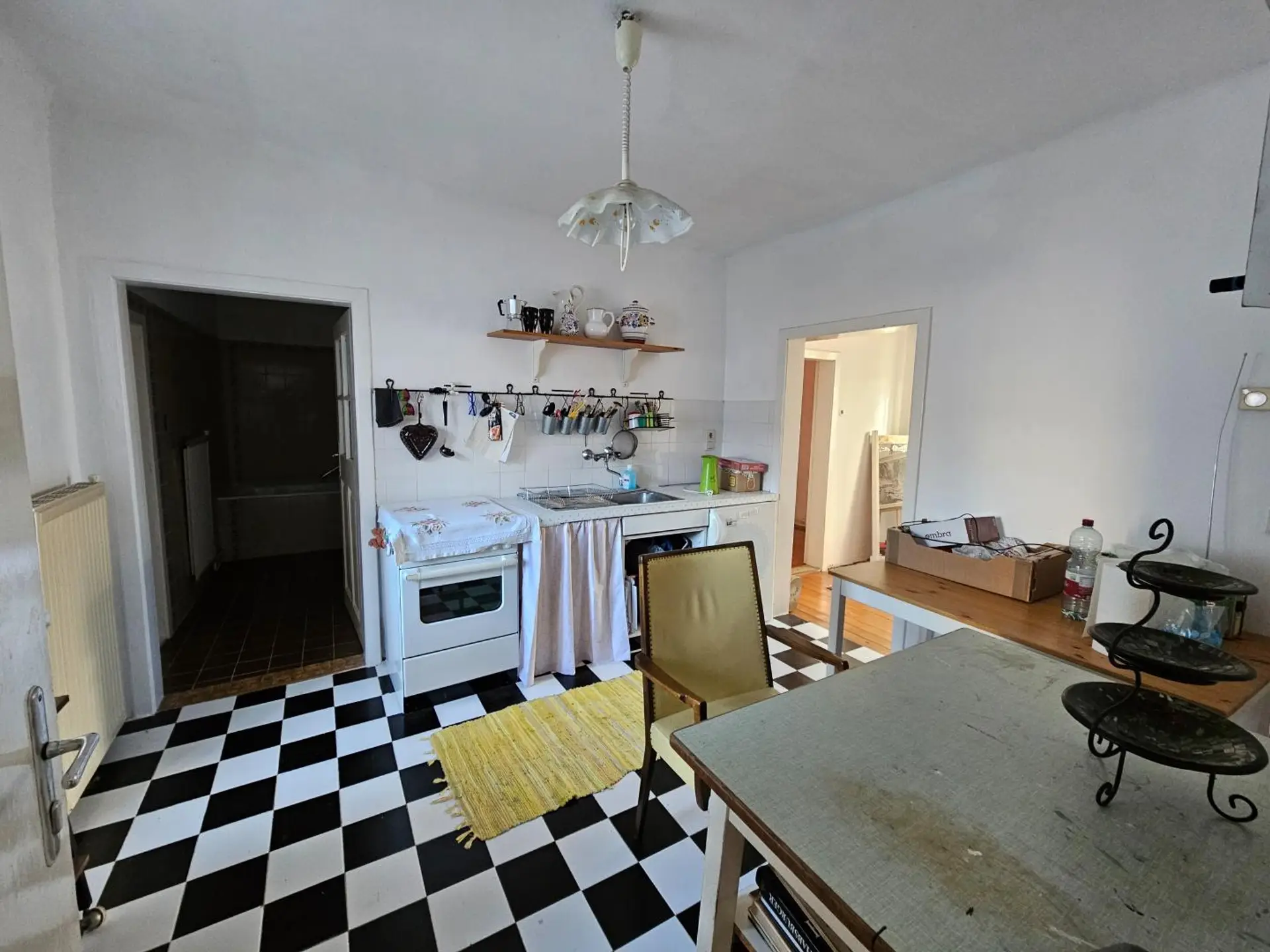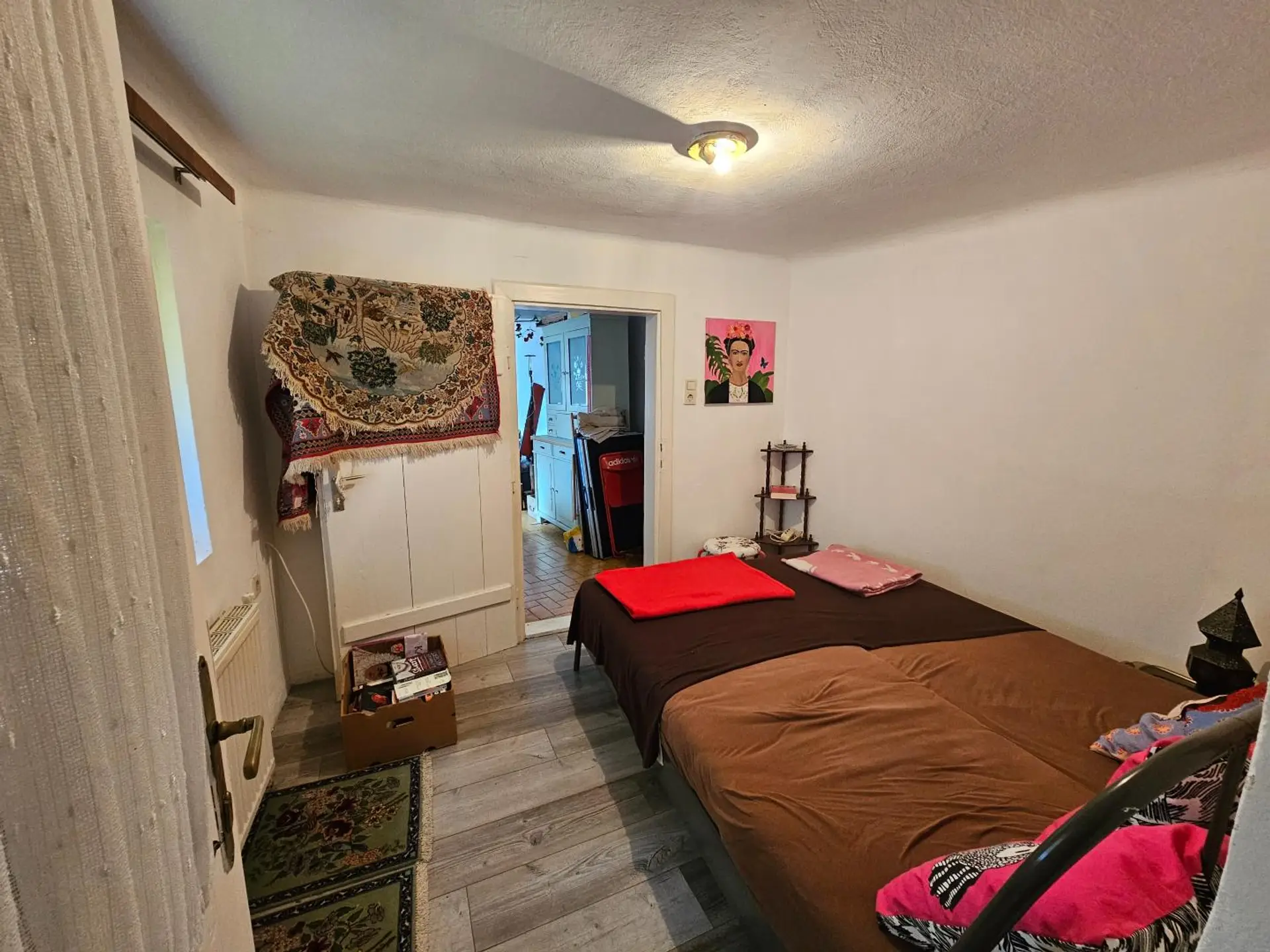 Es teilt sich auf in Vorraum, Küche, 3 Zimmer, Bad mit Wanne, WC und Wirtschaftsraum (siehe Plan bei Fotos). Im kleinen, geschmackvoll gestalteten Garten gibt es noch einen Abstellraum und eine Terrasse. Das Grundstück ist auch von hinten zugänglich.