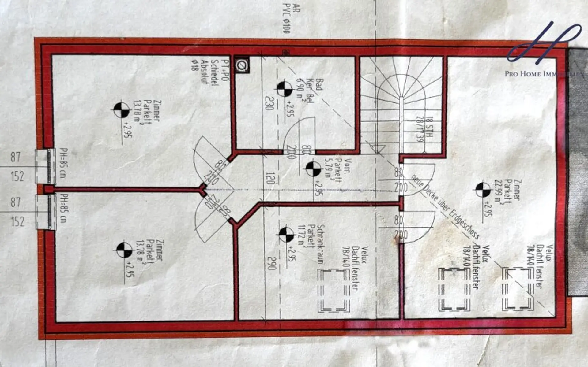 * 80m² Dachgeschoss: Vorraum mit Treppenaufgang, Badezimmer mit Badewanne, WC, Küche, Wohnzimmer, Schlafzimmer, Dachterrasse mit rund 20m²