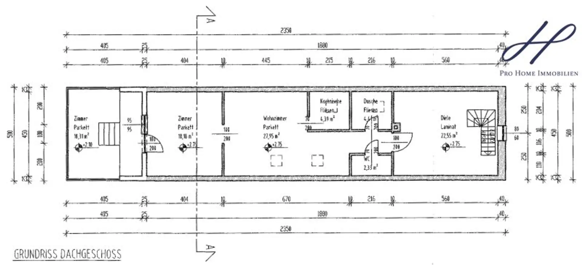 * _Dachgeschoss:_ 3 Zimmer, ein Schrankraum und ein Badezimmer mit Badewanne und WC