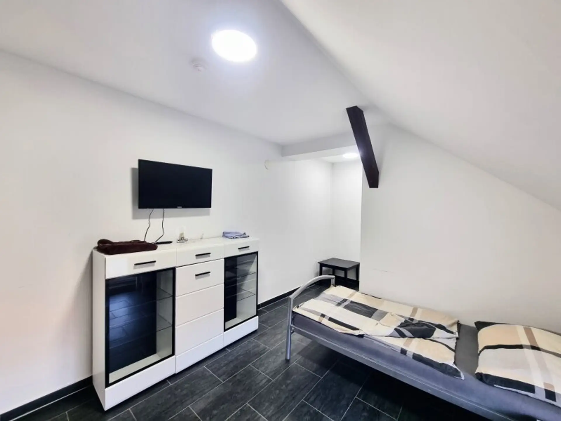 Auf dem großzügigen Grundstück befinden sich derzeit vier Objekte, die über zwei separate Zufahrten erreichbar sind – eine vordere Zufahrt für Gäste und Besucher sowie eine hintere Zufahrt für PKW- und LKW-Fahrzeuge. Zwei Gebäude sind in mehrere möblierte Einzelzimmer unterteilt und bieten insgesamt rund 70 voll ausgestattete Betten.