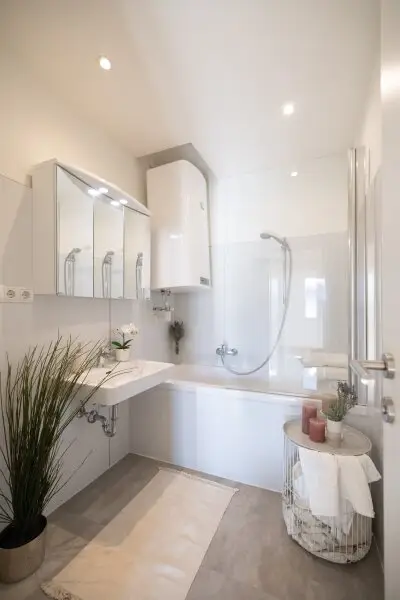 Das Badezimmer ist hell verfliest und mit Badewanne, Waschbecken, Waschmaschinenanschluss sowie moderner Beleuchtung ausgestattet. Zur Wohnung gehört ein eigenes Kellerabteil – ein PKW-Abstellplatz im Freien kann um € 7.500 zusätzlich erworben werden.