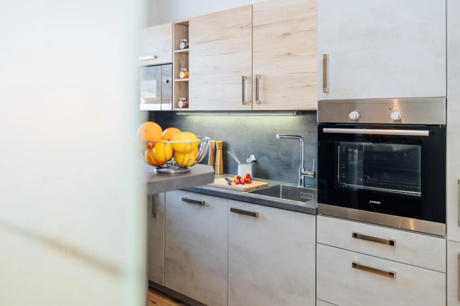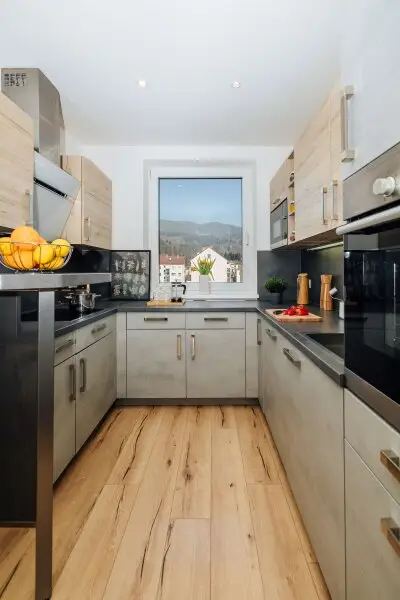 Die extra begehbare Küche ist mit E-Herd, Ceranfeld, Mikrowelle, Geschirrspüler sowie Kühl-/Gefrierkombination ausgestattet. Spots sorgen für modernes Licht und ein angenehmes Arbeitsumfeld.