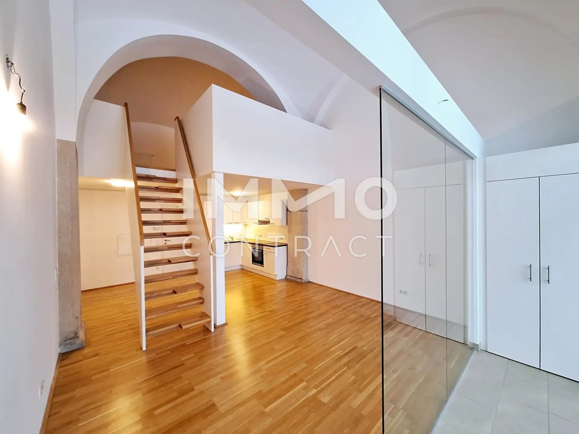 In der Erdgeschossebene befindet sich der Wohn-Essbereich mit moderner Küche und das großzügige Badezimmer inkl. WC. Eine Sambatreppe führt zur Schlafgalerie, die Raumhöhe von etwa 7 m verleiht dieser Wohnung ein einzigartiges Ambiente.